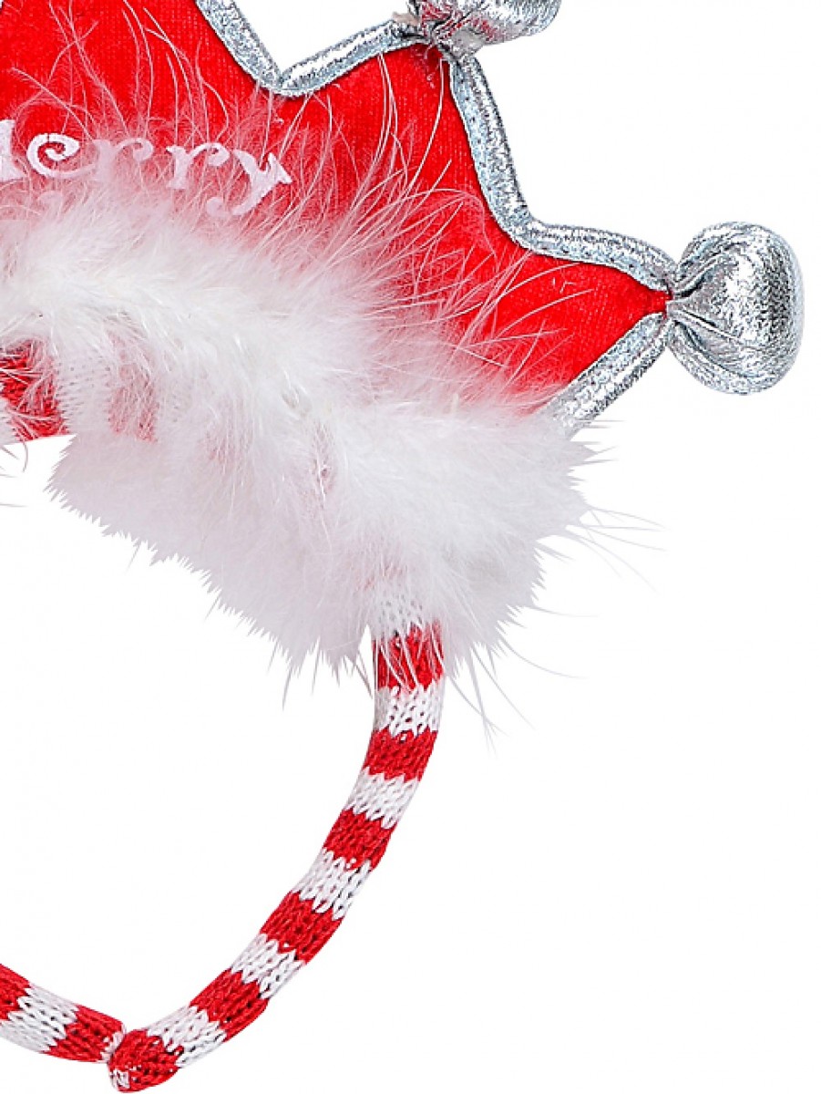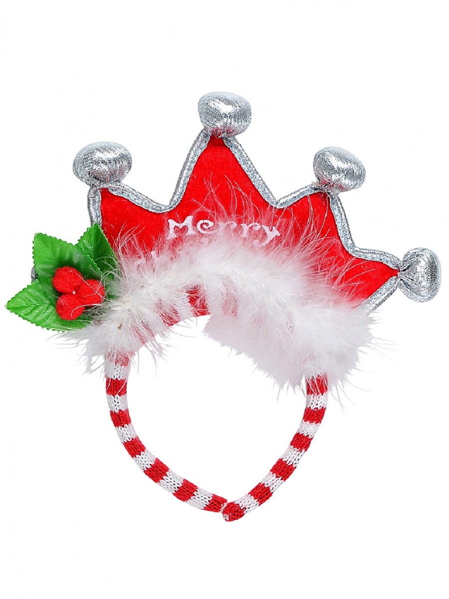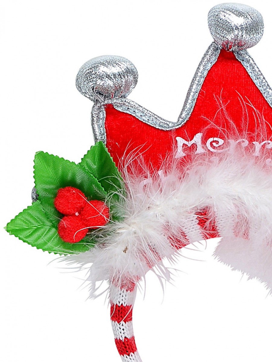 The Merry Christmas tiara headband makes anyone the undisputed princess of Christmas. These individually sold accessories are highlighted with metallic trim and a holly leaf. The Merry Christmas tiara headband attaches to the head by means of a candy cane striped headband with white furry trim. The crown is tall and made of a velvety red material with a silver trim. It says Merry Christmas on the front of it in silver glitter. The whole thing is accented by a imitation sprig of holly of to the side. Rather than the typical Santa hat, reindeer antlers, or elf ears the Merry Christmas tiara headband will really stand out from the crowd. A Merry Christmas tiara headband is the perfect accessory for holiday parties or wearing around the office during Christmastime. It makes an excellent stocking stuffer as well. Perfect for the flamboyant Christmas princess who likes to wear tiaras around town.