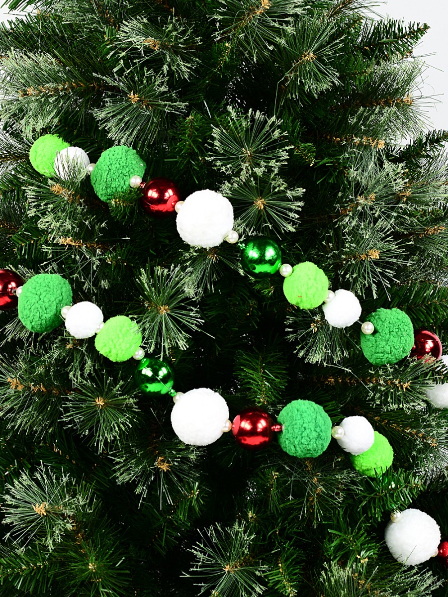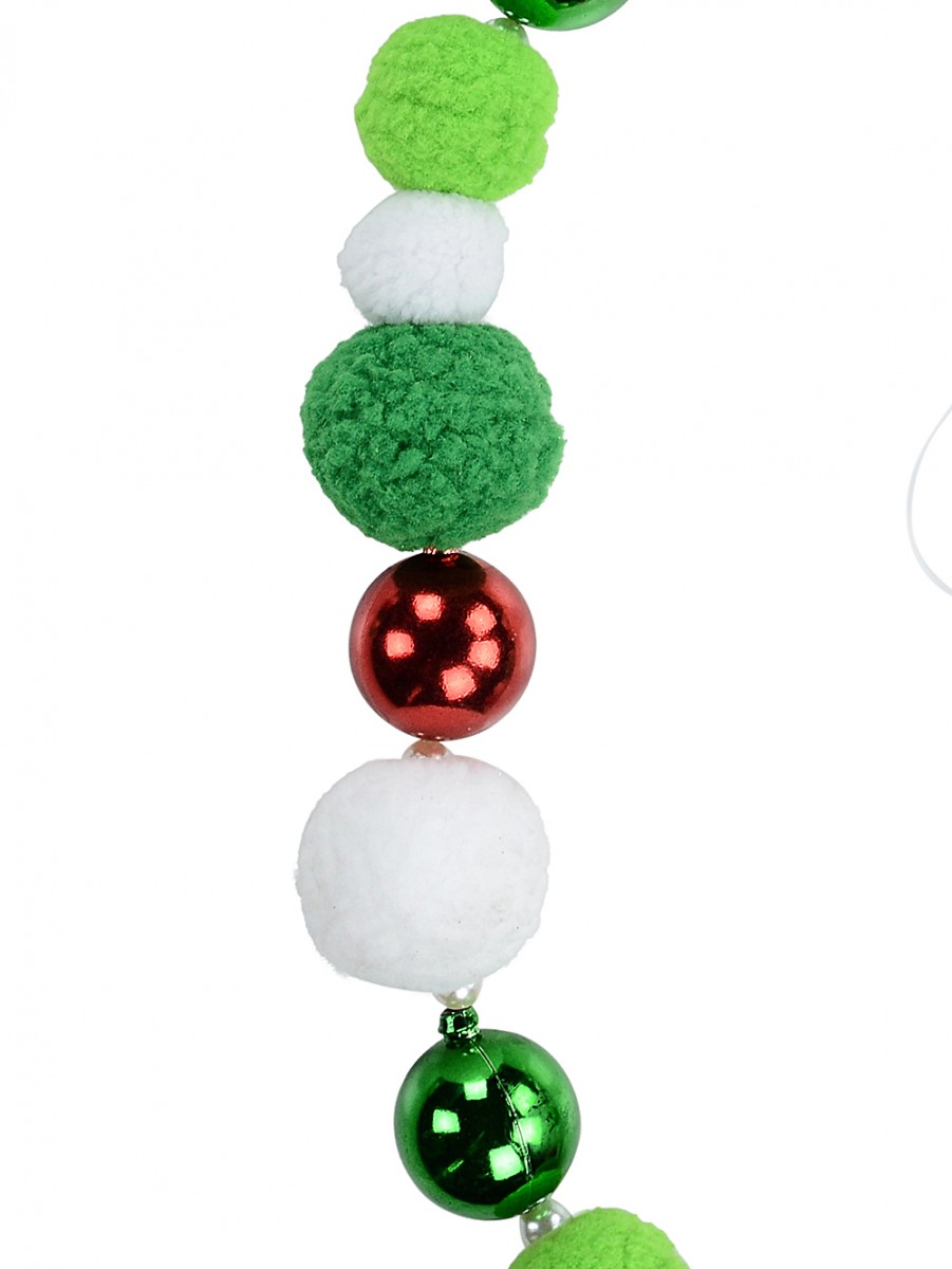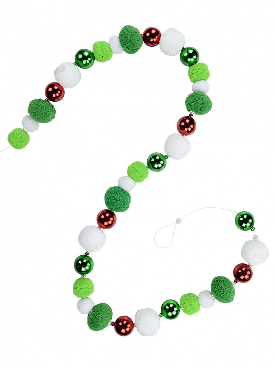 Crafted with meticulous attention to detail, the garland features a captivating mix of metallic and plush baubles securely strung along a durable nylon string. The variety in bauble sizes and textures includes 35mm and 50mm white plush pom-poms, light green 40mm plush pom-poms, and striking 55mm green plush pom-poms, all harmoniously accented by 35mm metallic red and green baubles. Threaded with 6mm pearl bead spacers, the alternating styles and colours form an elegant and coherent design that effortlessly elevates your Christmas décor.