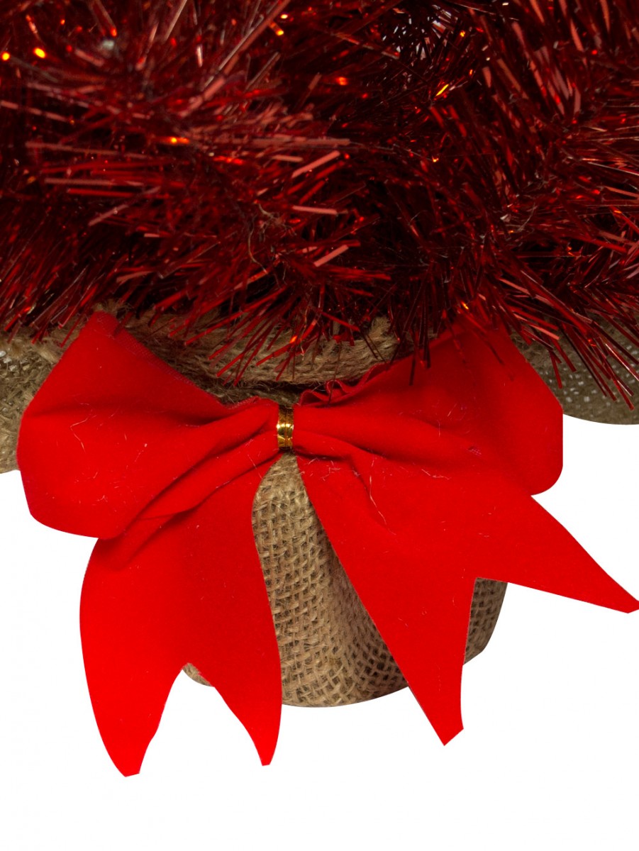? Tree is "potted" so it stands on its own, and base is wrapped in burlap. It stands more than 1 1/2 feet in height and has a bright red ribbon and bow tied around the bottom.