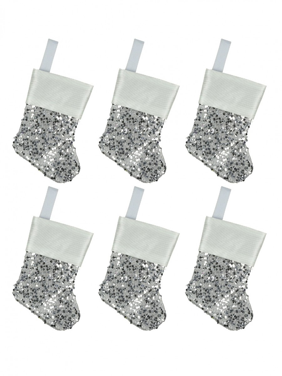 Glam up the holidays with a shimmering touch by decorating with these silver sequin mini stockings this year! The mesh overlay with tiny sequins in metallic silver colour cover the front of the stockings to add a fun, festive glow to any room while the soft white satin cuff wraps around to give a bit of contrasting texture.