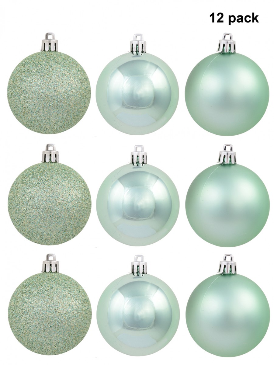 The Mint Green Matte, Glitter & Shiny Baubles is an assortment of three differently designed Christmas baubles. These exquisitely appealing colourful baubles are packaged as a dozen in every pack with each pack containing four of each of the three decoratively designed baubles. The first of the baubles is hued in matte green palette with the aim of adding a cool look to your Christmas decoration. The second is coloured in Glittered green with occasional blue glitters with the aim of adding a sparkling look to your Christmas decoration. Finally, the third design of this pack of 12 baubles features a spherical bauble with a shiny, glossy, soft green surface designed to fit right in with your Christmas tree.
