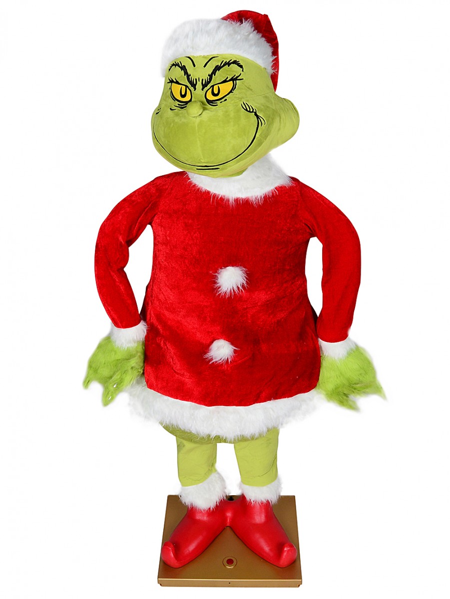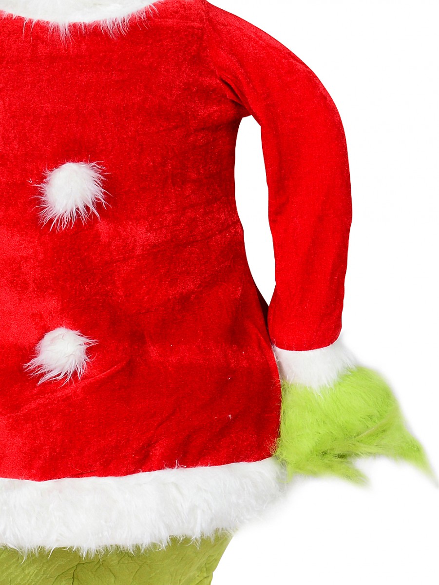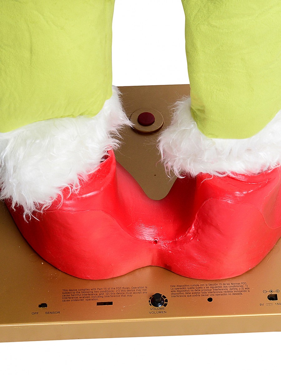 Mr Grinch is depicted in his typical style featuring a green Grinch wearing red coloured jester boots underneath Kelly green pants with white faux trim. On top is a Santa velvety red coloured jacket with the usual white fluffy faux trims and a red pointy Santa hat to complete the picture. As expected, Grinch has his usual angry-looking eyebrows. His red jester boots are jointed at the back while he places his green coloured arms on his hips as he is ready to dance to the pre-programmed song "You're a Mean One Mr Grinch. It also comes with four spoken dialogues that can be activated with the touch of the button at the foot. It meets with Australian safety and performance standards.