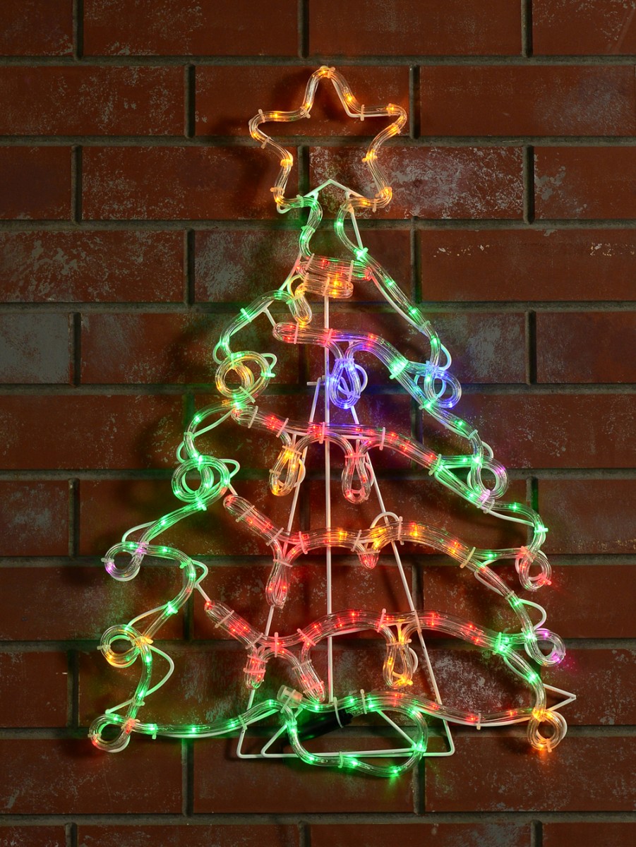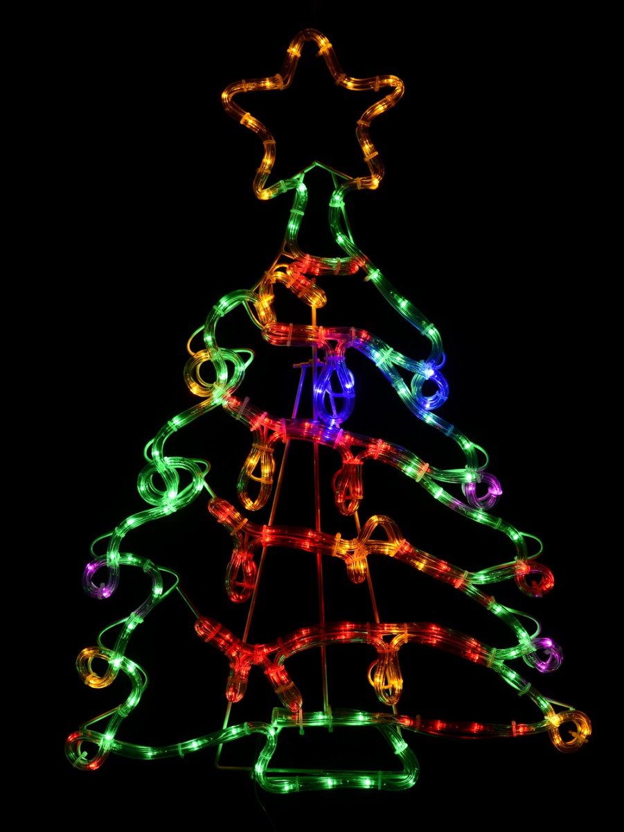 Show your neighbours, family, and friends your Christmas spirit with this attractive Christmas tree motif having unique multi coloured loopy ends topped with a bright yellow star! This lovely tree silhouette is constructed with flexible rope light that forms the outline of a Christmas tree attached to a sturdy metal frame with stand for easy placement and measures 72cm x 50cm x 72cm.
