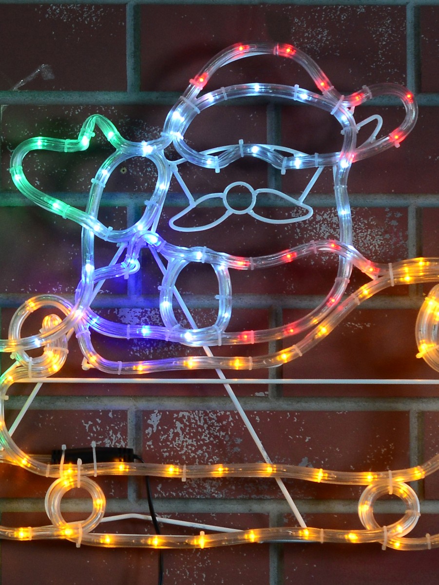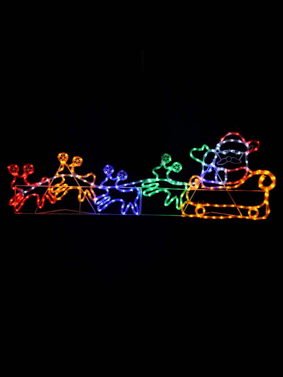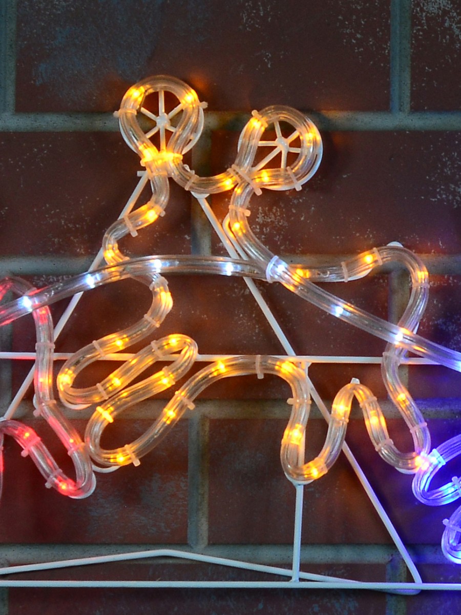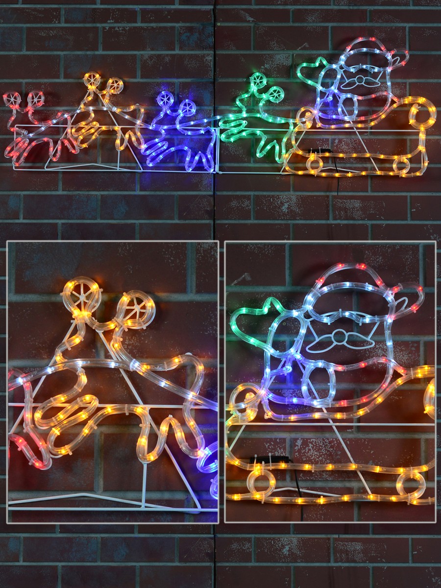 The most retold story of Christmas as children, besides the birth of Christ, is the story of Santa delivering his presents to all the kids around the world. This rope light silhouette is sure to remind you of that story because it outlines a Santa being flown over the skies by four colourful reindeers. These reindeers are blue, green, red and orange in colour and are pulling Santa dressed in red in an orange sleigh with a white-coloured harness. These brilliant lights shine because of a combination of 264 multi-coloured LED concave light bulbs inside a clear tube. This rope light comes with a speed function adapter that allows you to change the illumination pattern from static to seven different kinds of sequences. Get this rope light to add a colourful twist to the usual story.