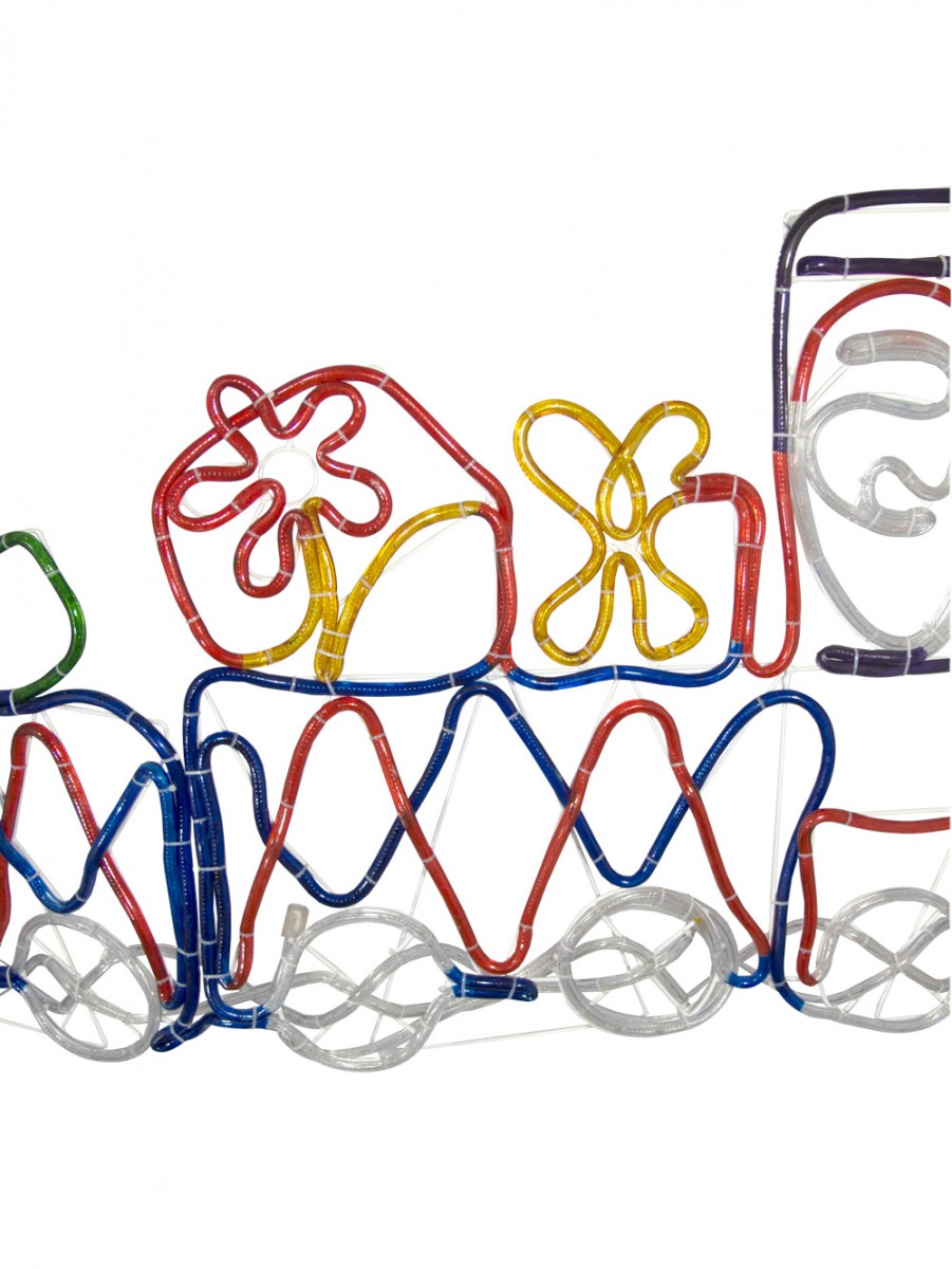 ? The silhouette is created from red, white, blue, green, and yellow LED lights that are housed in weather resistant safe tubing.