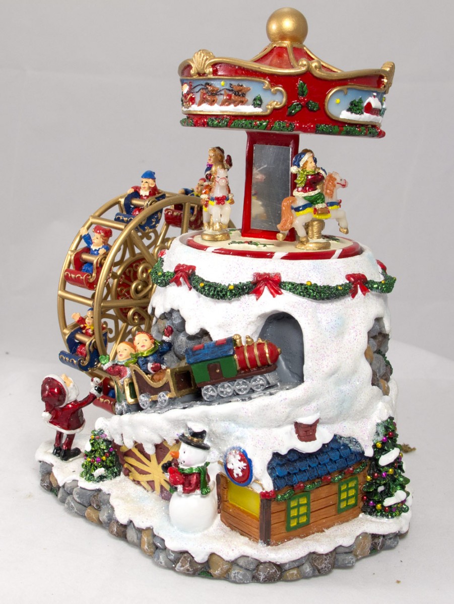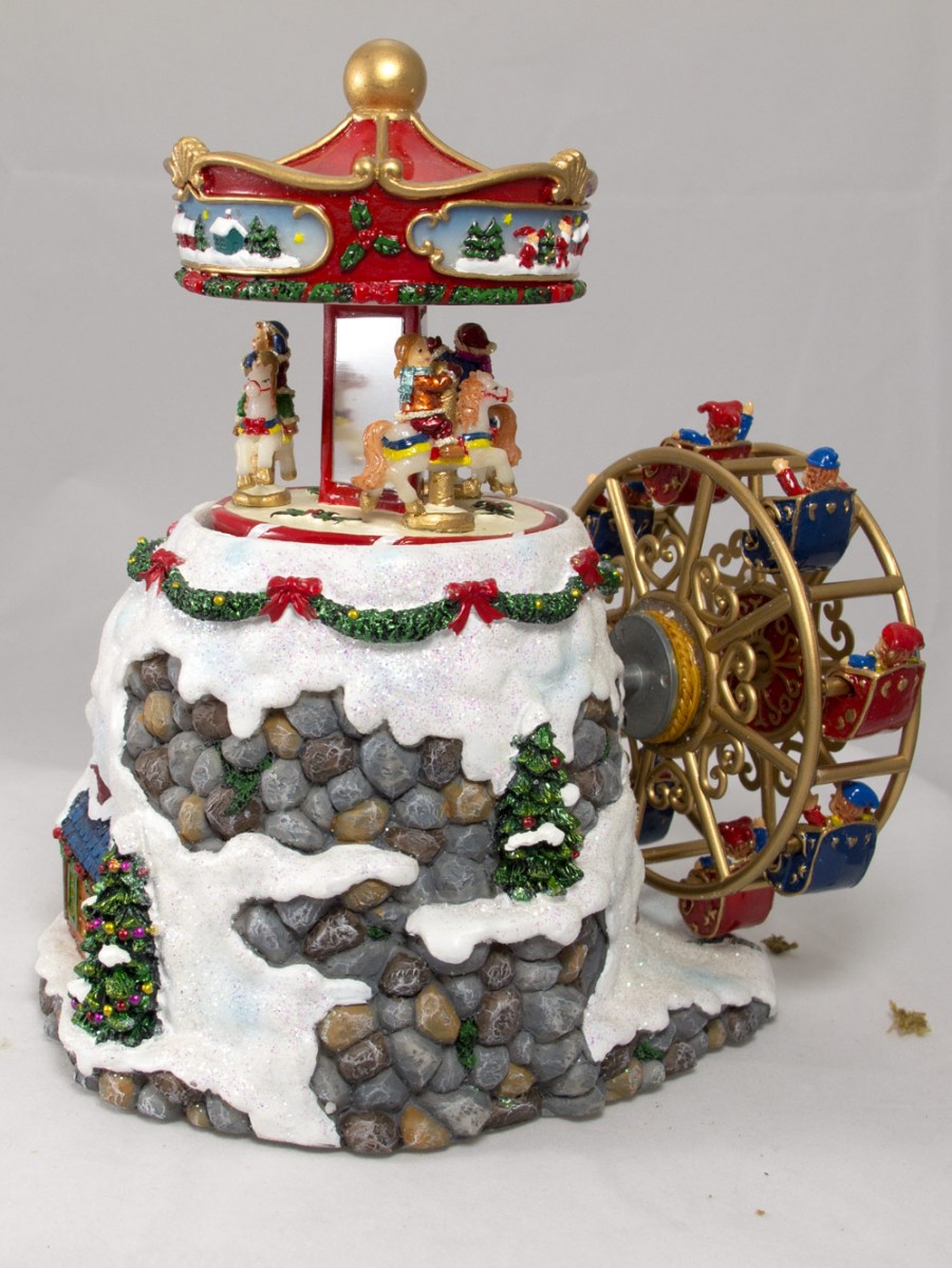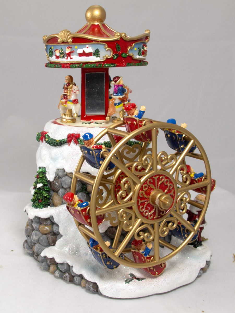 Did you ever wonder what Santa and the elves do when they're taking a break from work? They go on rides, of course! This Wind Up Musical Carousel & Ferris Wheel features elves riding on an ornate gold, blue and red Ferris wheel while up top of a snow-covered rock pile, even more elves ride a stunning multi-colored carousel. More elves are riding in a train going up the mountain as Santa ? decked out in his red and white attire ? observes from down below. A dressed up snowman stands guard on the side. The best aspect of this decorative piece is that the Ferris wheel and carousel rotate while "We Wish You a Merry Christmas" plays. Measuring at 155mm x 180mm x 125mm, the decoration piece is a work of art and one you'll proudly love to display in your home. It also makes a stunning gift for anyone who could use a little extra Christmas cheer.