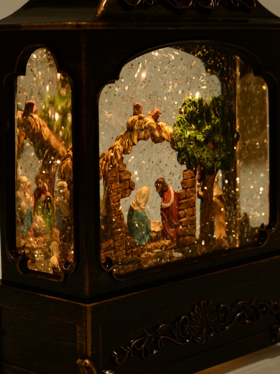 The Nativity Scene Christmas Wood Stove Look Musical Lantern Snow Globe is designed to resemble an antique wood stove, complete with intricate details that evoke a sense of nostalgia and warmth. To add an extra layer of charm to your festive decor, this snow globe plays the soothing melody of 'Silent Night,' filling your space with the peaceful sounds of Christmas.