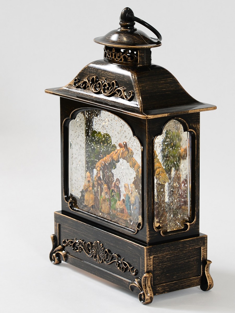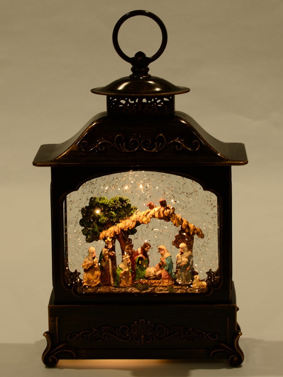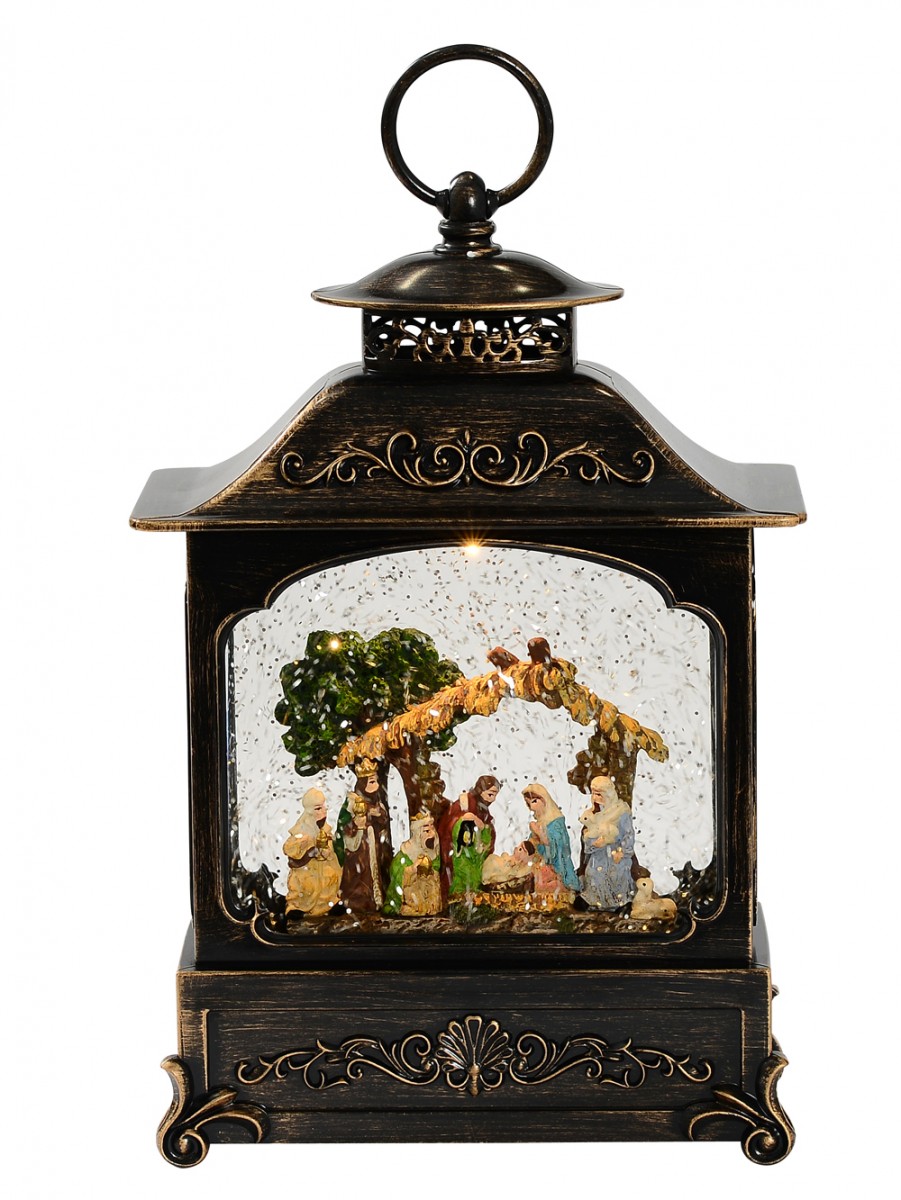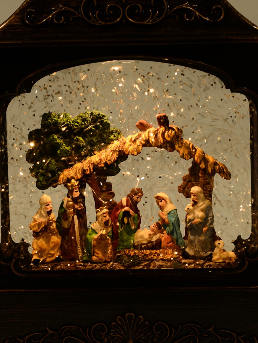 Featuring a depiction of baby Jesus in the manger, surrounded by Mary, Joseph, and the Three Wise Men. Each of the wise men is presented with their gifts in hand, paying homage to the newborn King. The stable animals complete the scene, creating a serene and timeless tableau. One of the most enchanting features of this snow globe is its swirling glitter animation. With the flip of a switch, a gentle whirlwind of iridescent glitter swirls around the Nativity scene, creating a mesmerising and magical effect. The battery-operated illumination casts a soft, warm glow upon the scene, enhancing its beauty and making it a stunning focal point in any room.