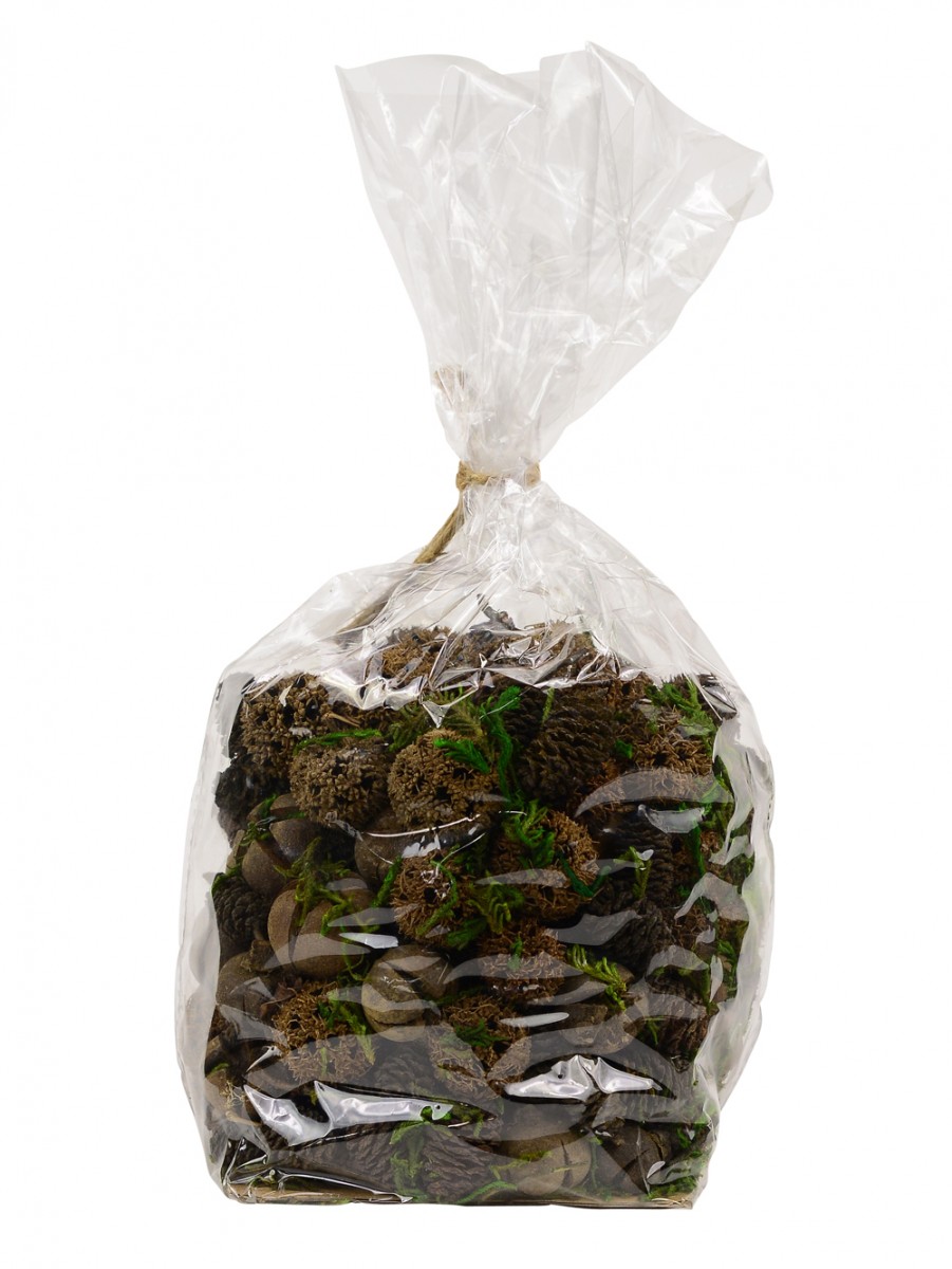 Continue your earthy decorative theme with this multi purpose bag of natural look decorations. Bag contains an assortment of brown cross fruit, mini pine cones, brown luluballs & greenery Sold individually