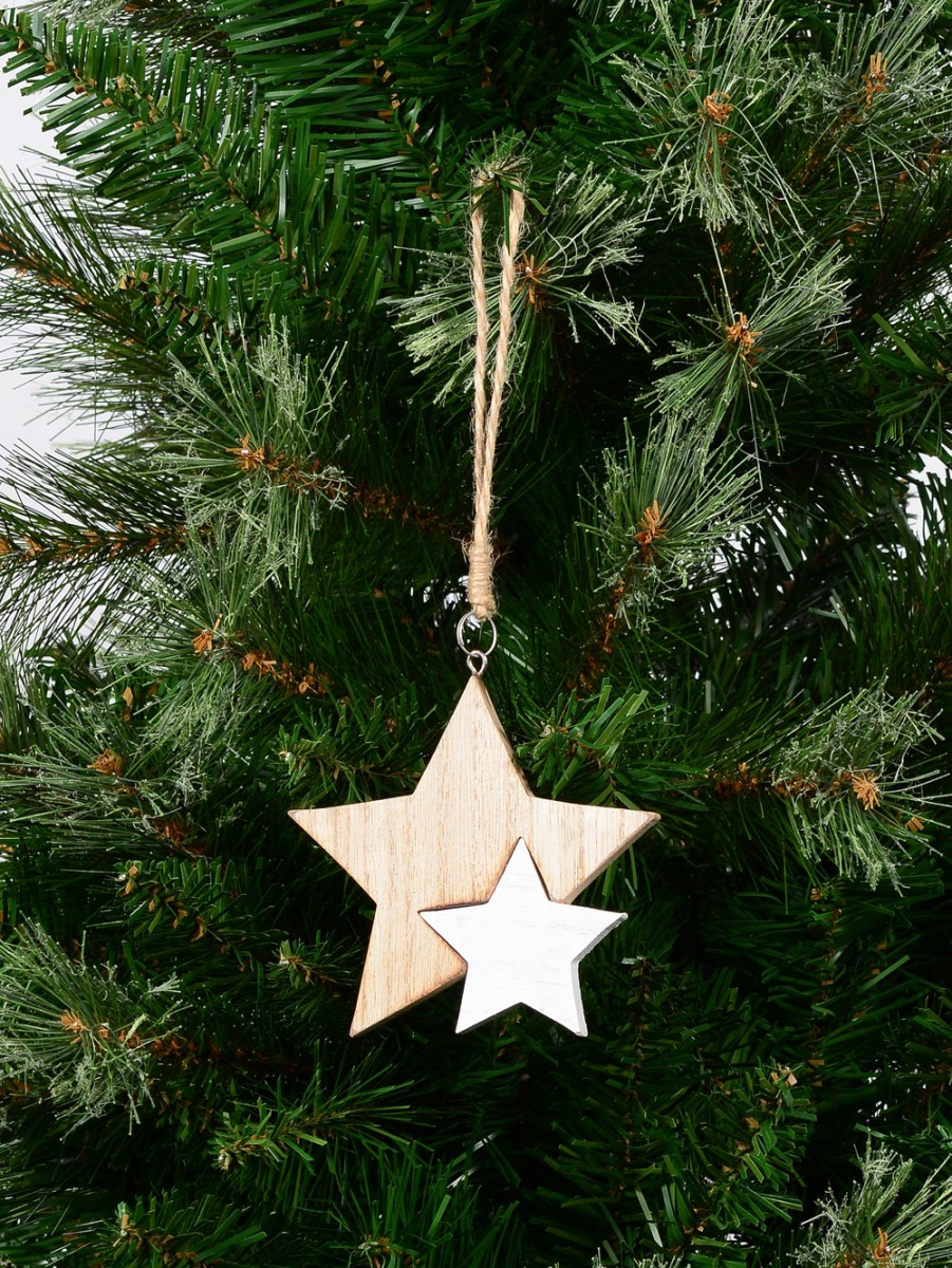 Increase the beauty of your decoration this Xmas by double fold when you use this 2-in-1 jointed Natural & White Wooden Five Point Stars Hanging Decoration. This hanging ornament features an ingenious fusion of two laser cut wooden decor item for the purpose of greater decorative effect.