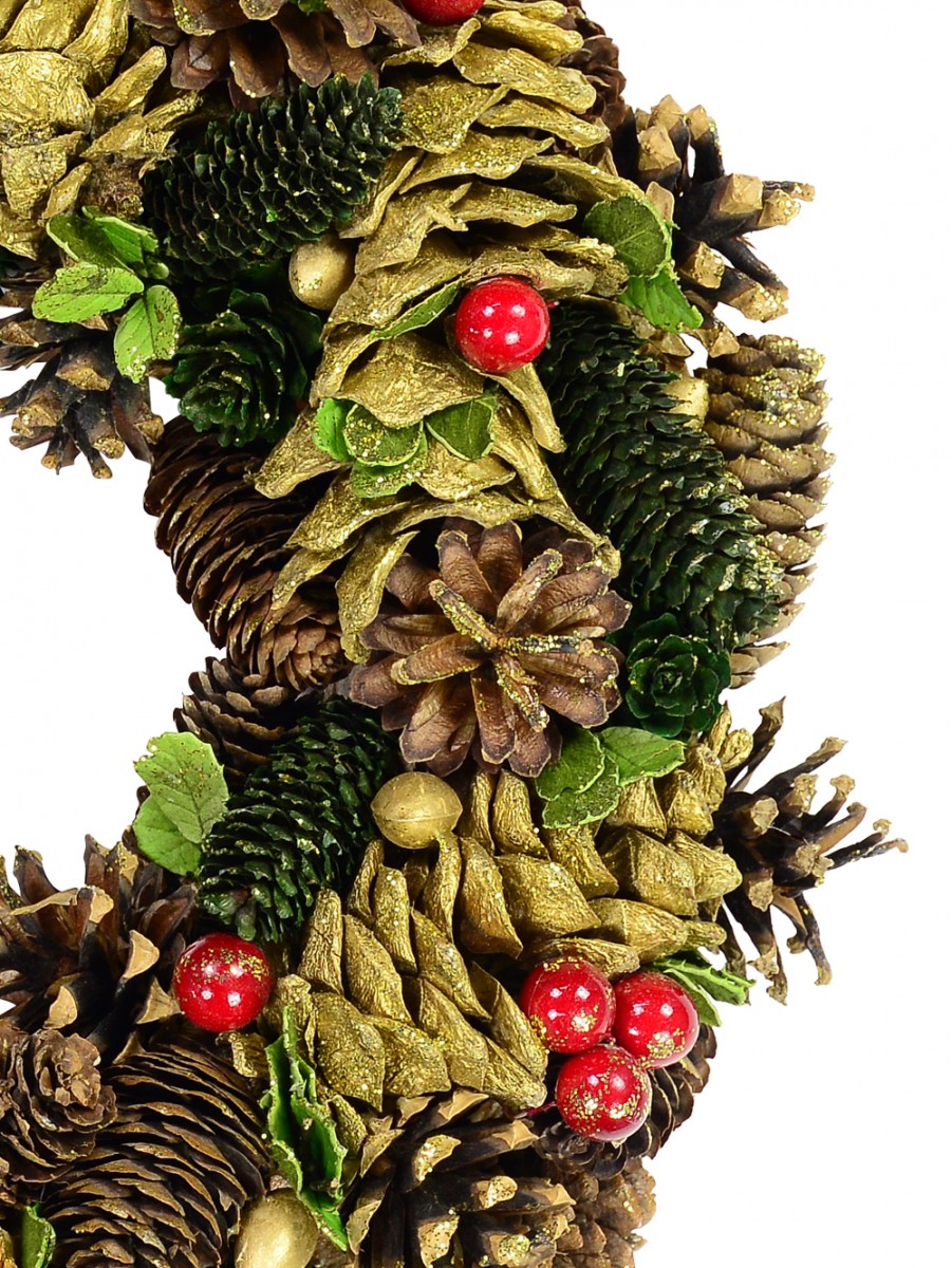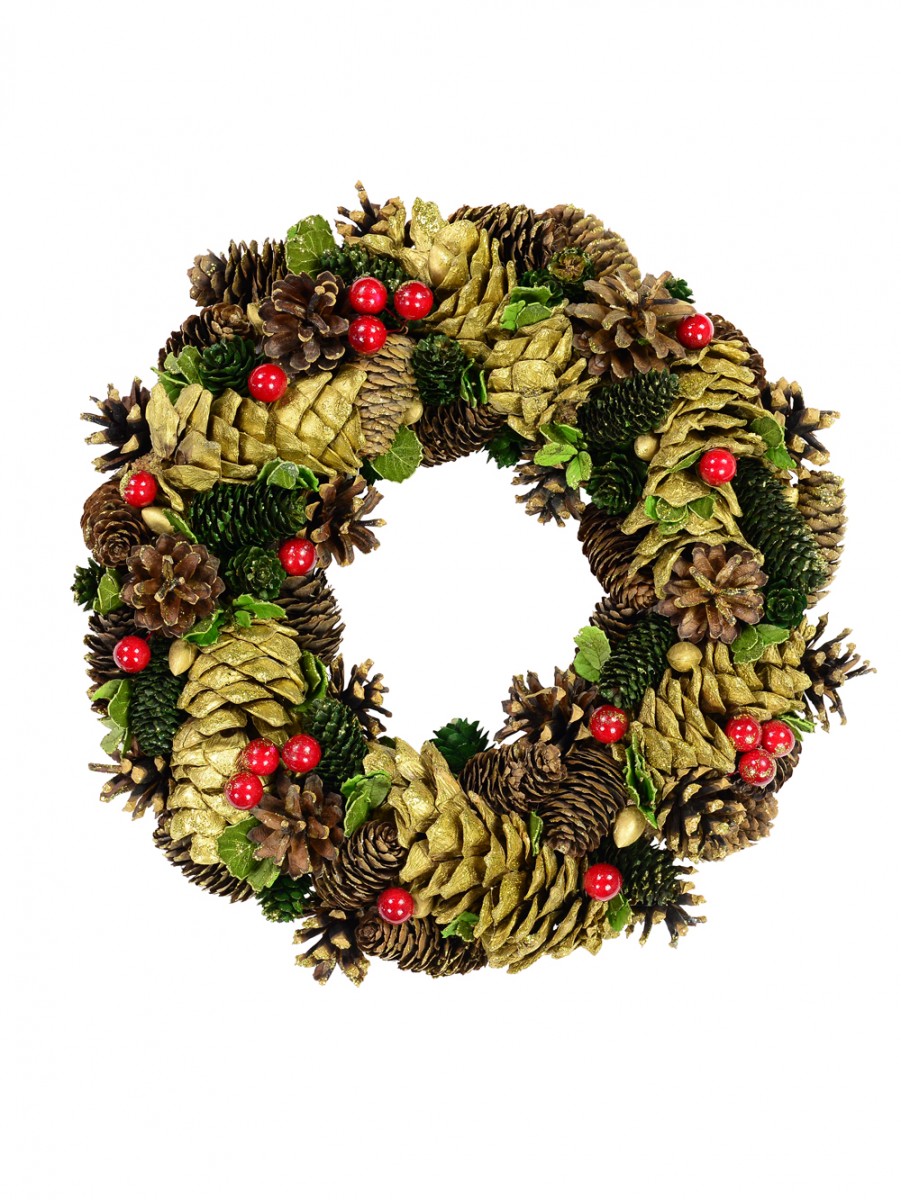 A magnificent natural wreath of pine cones, coloured in browns and golds and greens with delightful holly berries as well. A stylish natural piece that can serve as a wreath or a centrepiece.