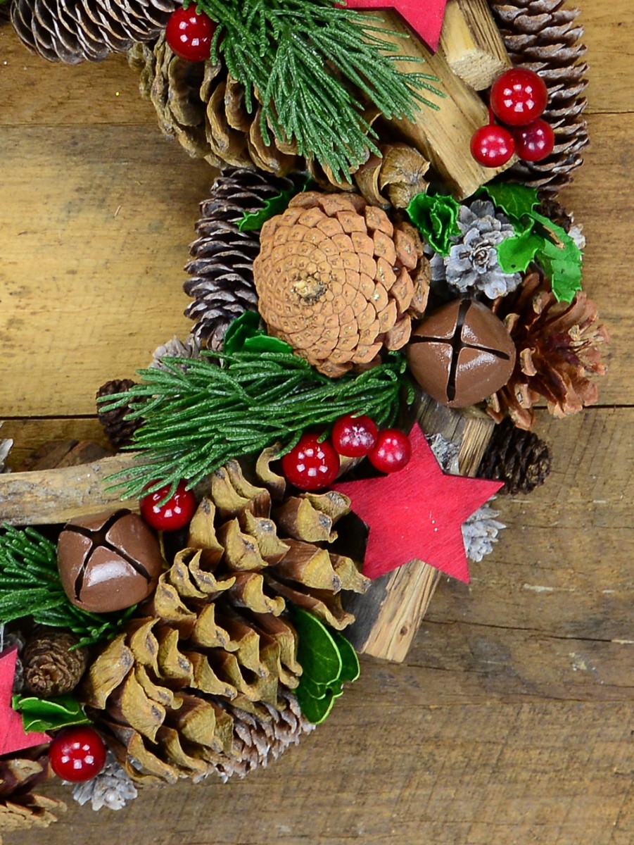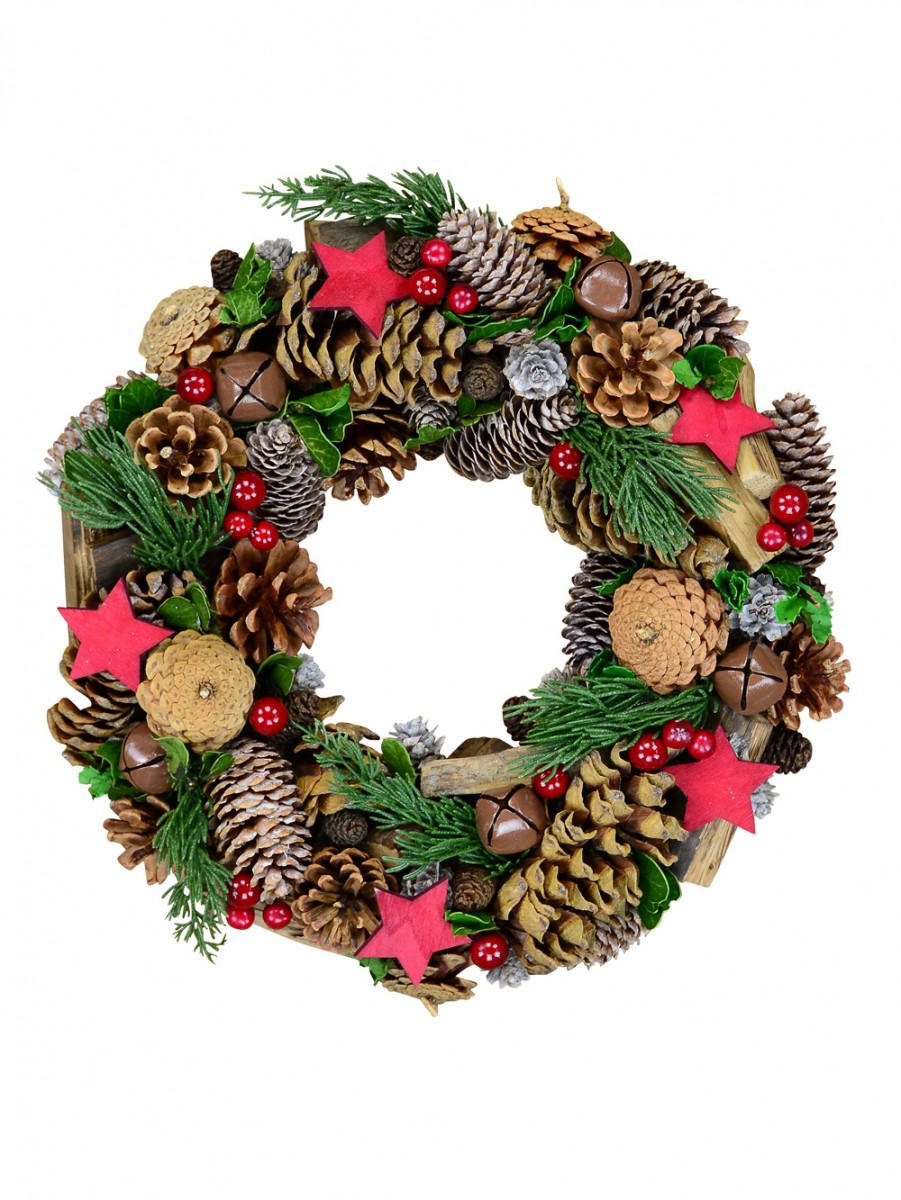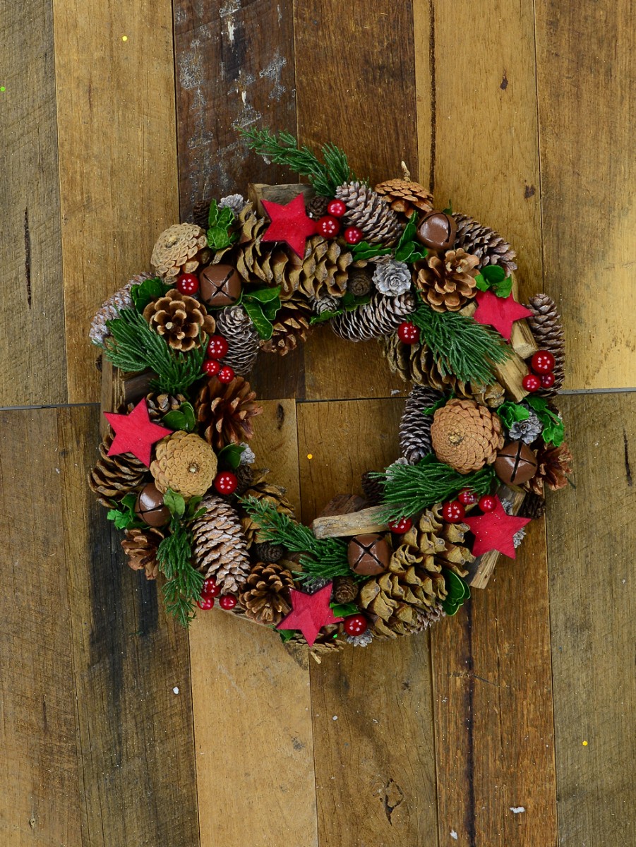 Bring in the beauty of natural forest environment into your home, shop, store, office and environs when you decorate these places with this charming Natural Forest Wreath Decoration With Various Pine Cones, Stars, Wood Chunks, Berries & Bells. It is a forest focused floral wreath wreathed using forest obtainable items except for the included bells.