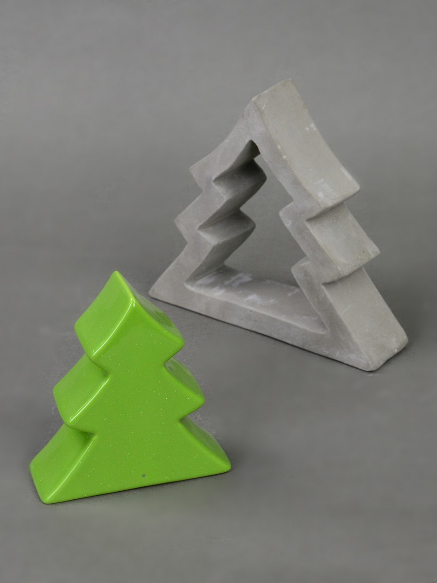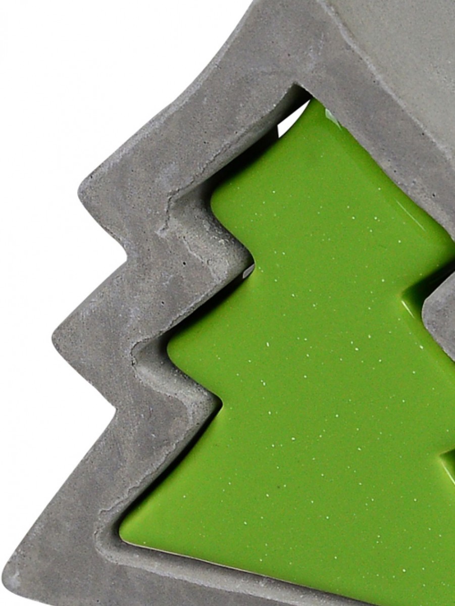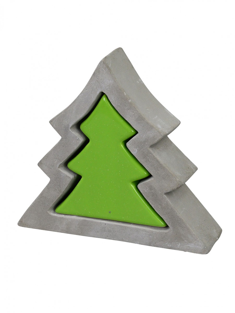 Simple and cute, this double tree standing ornament will bring an unusual festive touch to any tabletop and will blend seamlessly in the countryside, urban or industrial style home. This quaint little decoration item measures 18cm x 4cm x 16cm in dimension and has an outer concrete grey coloured tree with a smaller green tree nesting inside.