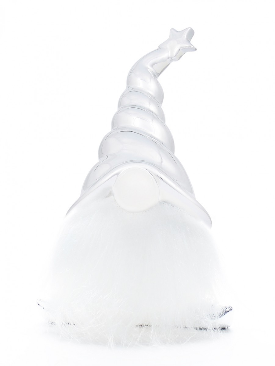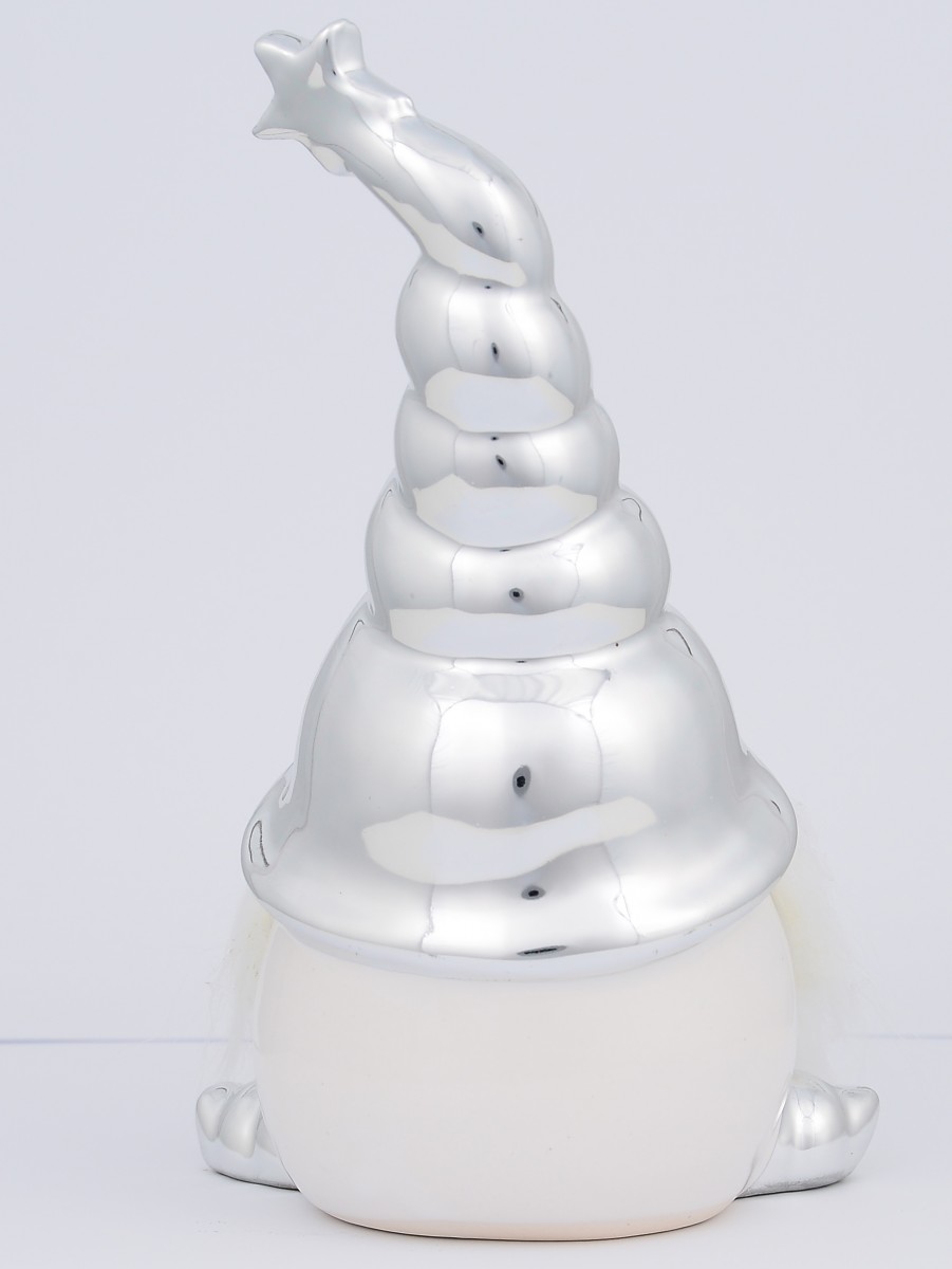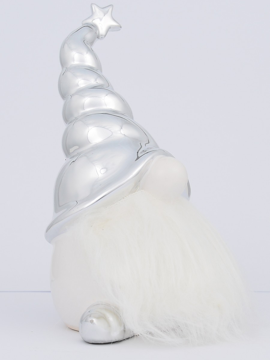 Apart from the obvious ornamental functionality of this Nisse Santa With Glorious Beard Ceramic Christmas Ornament, it is also a ceramic item that would be perfect for gifting to family, colleagues, friends, and loved ones in general in the spirit of Christmas giving. Using top quality ceramic material that is hued in white and glazed in silver, it showcases a silver glazed hat which has a star topper and looks like a typical wizard's hat. Santa's large nose and fluffy white beards are also depicted in this figurine.