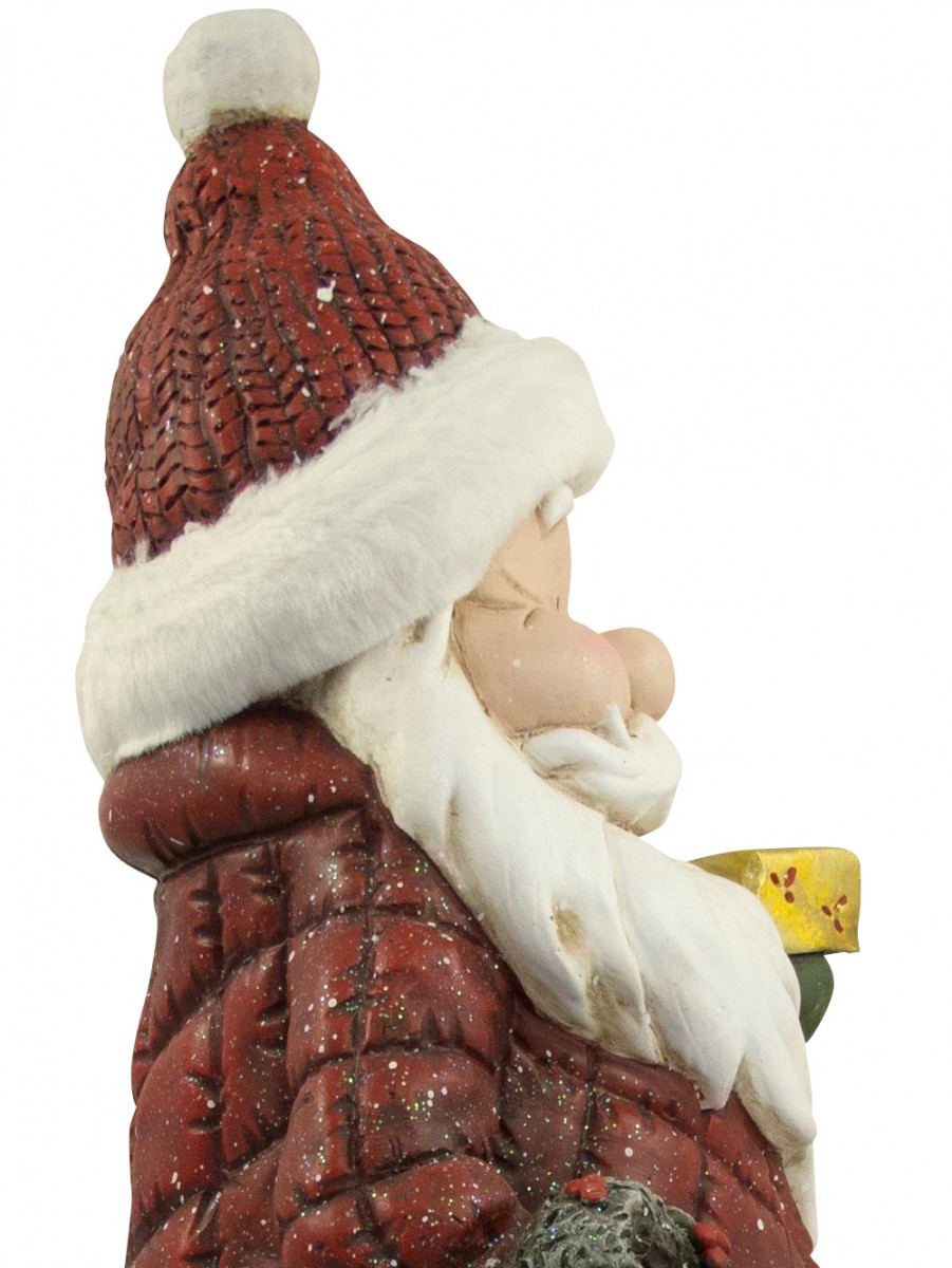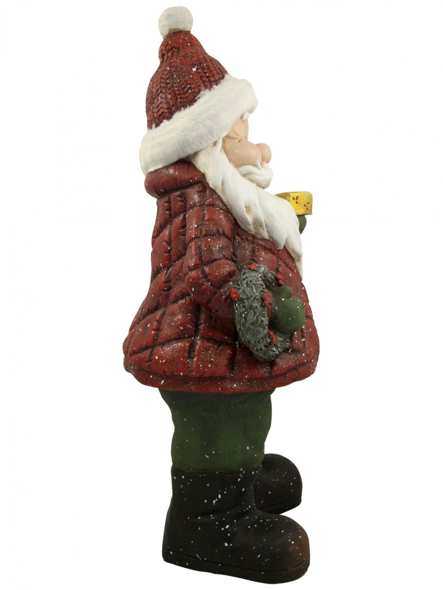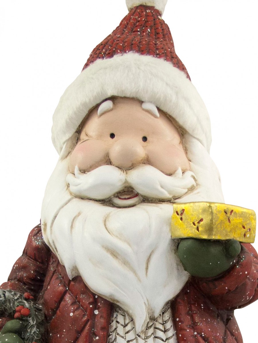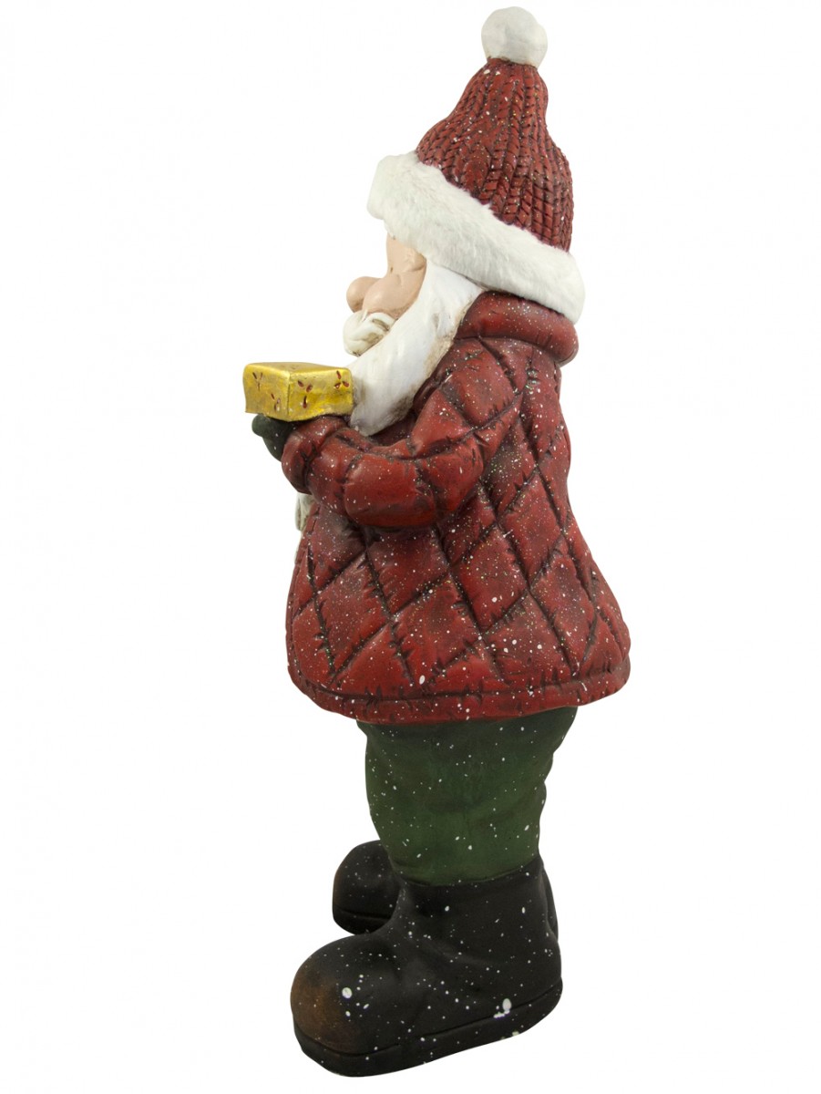 This decoration is a must for all households who love Christmas! Santa is one of the greats. A man whose entire purpose is to provide joy to children around the world. The joy he brings to children is priceless; he is loved by children from all different countries and religions. Our decorative statue of Santa reflects he demeanour; happy, jovial and giving. Standing wearing a grey jumper with a wool trim hat holding a gift, Santa needs to be in at your Christmas.