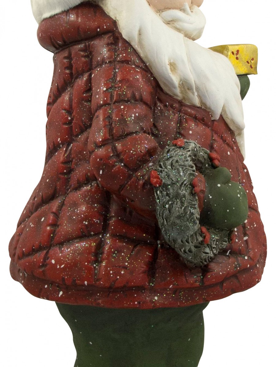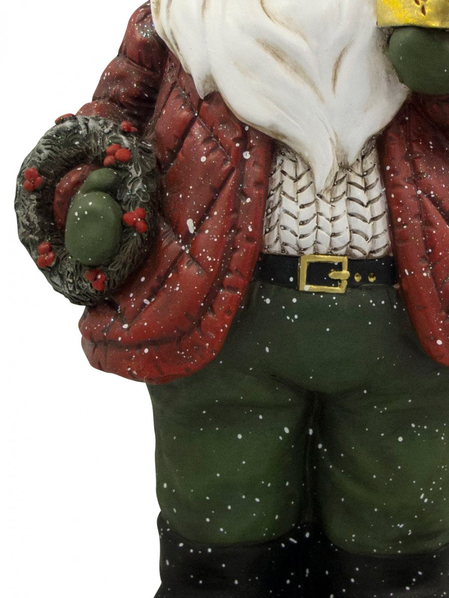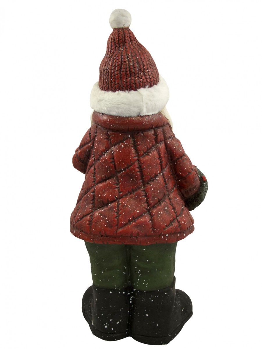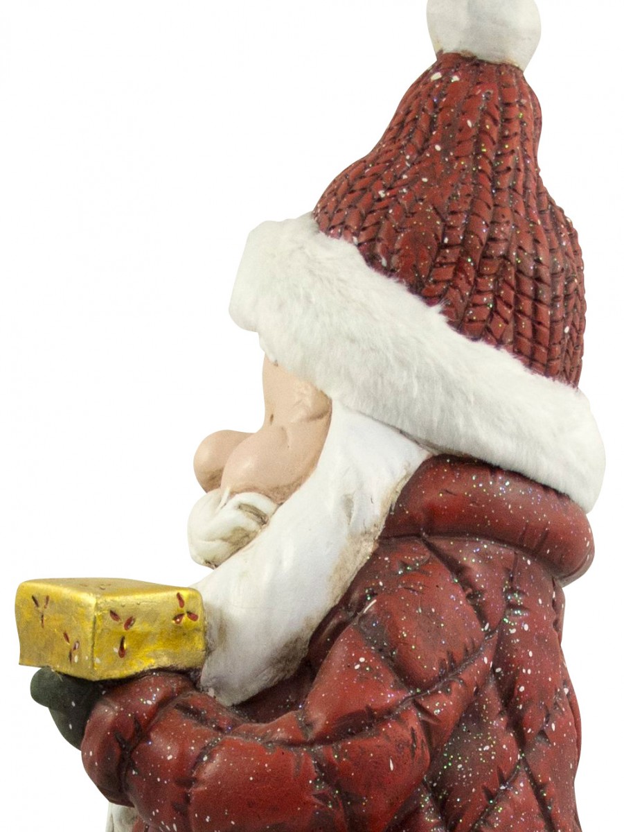 This decoration is a must for all households who love Christmas! Santa is one of the greats. A man whose entire purpose is to provide joy to children around the world. The joy he brings to children is priceless; he is loved by children from all different countries and religions. Our decorative statue of Santa reflects he demeanour; happy, jovial and giving. Standing wearing a grey jumper with a wool trim hat holding a gift, Santa needs to be in at your Christmas.