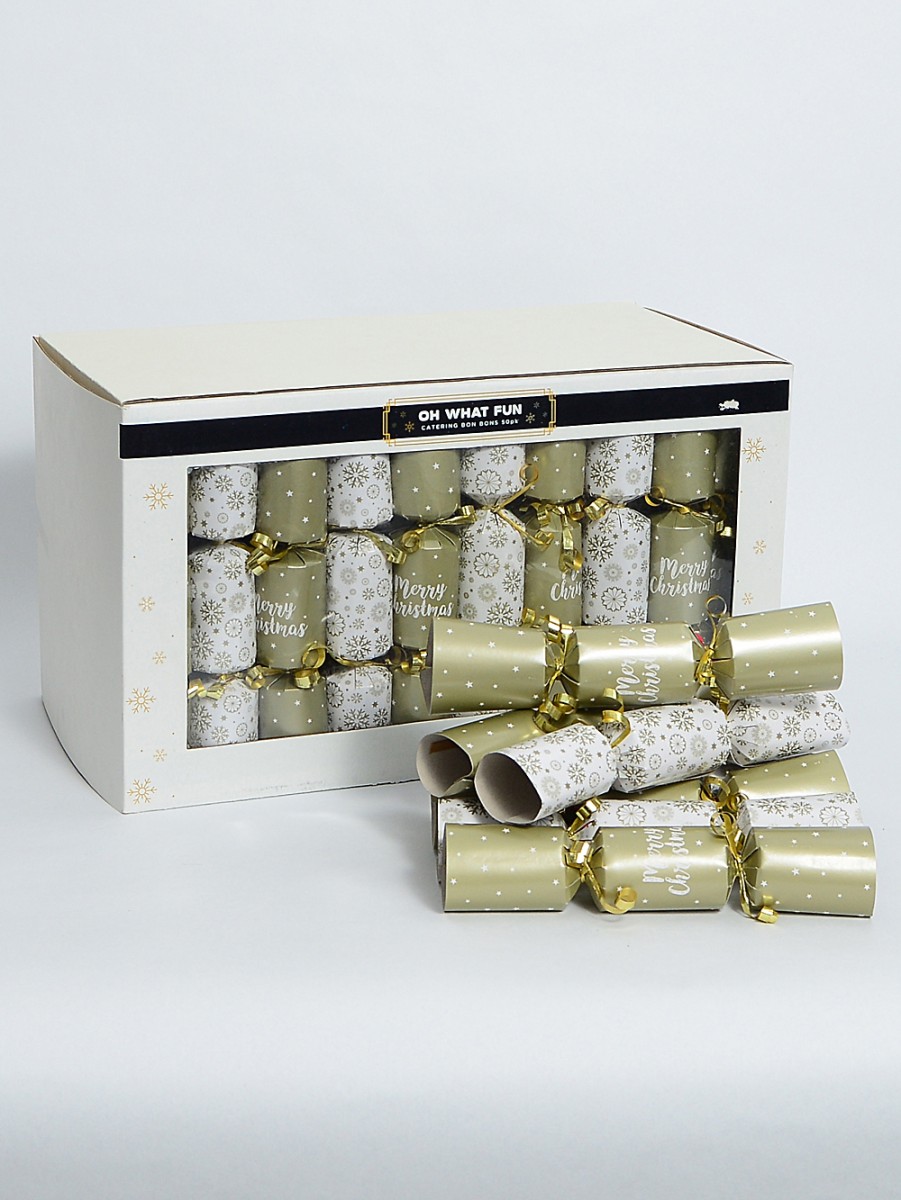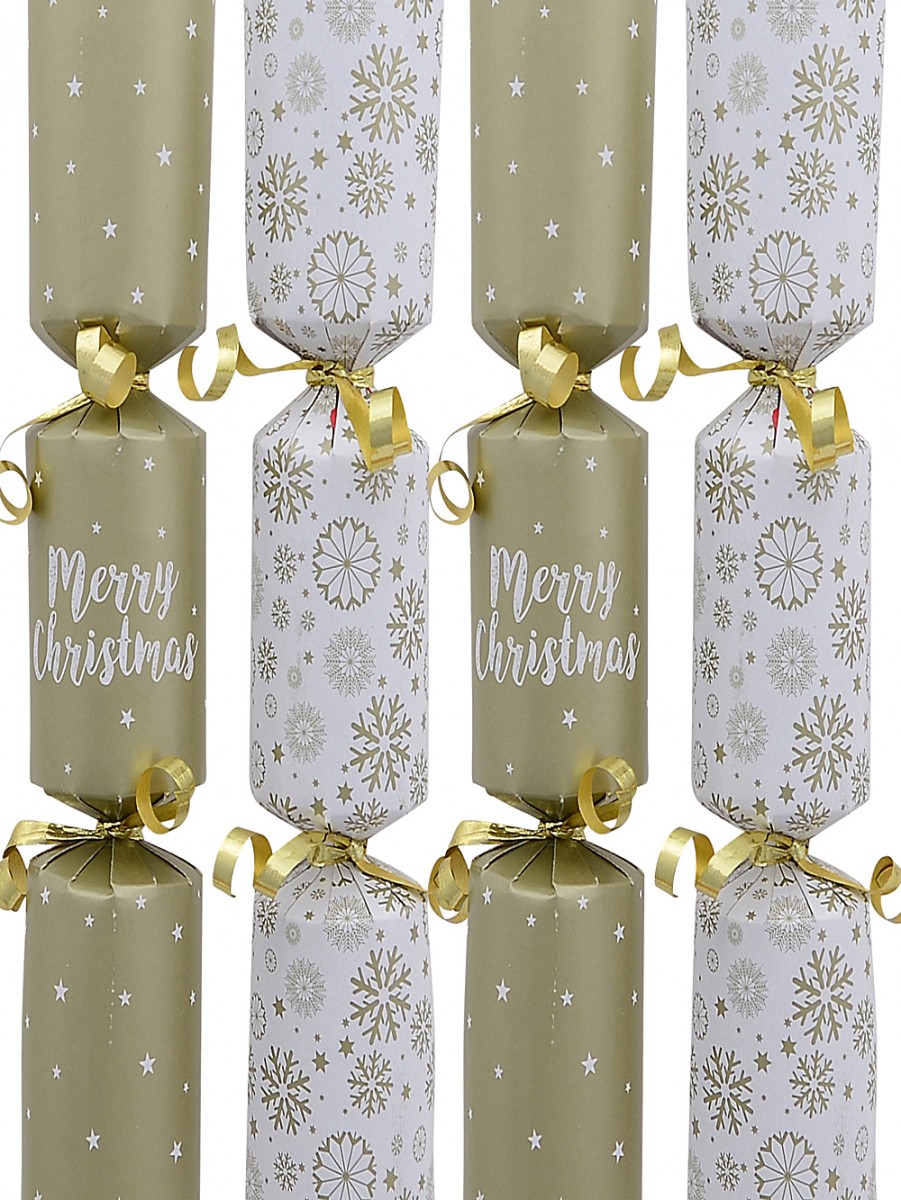 The twists of these lovely Olive Green & White Snowflakes & Font Christmas Cracker Bon Bons are tied up using shiny gold coloured mesh ribbons. These adorable Christmas crackers are a perfect gift item you can give to family, friends, colleagues at work, neighbour at home, and whomever else the spirit of Christmas giving directs you to. There is more than enough for everyone as it is sold as a pack consisting of 50 crackers.