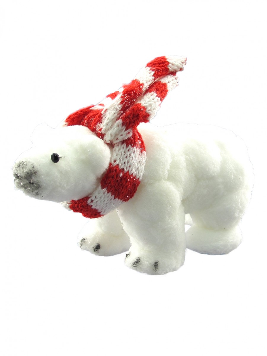 Relatively light-weight, the polar bear is made of flocked styrofoam and covered in white, cotton fur. The bear is 23cm long and 12 cm high. Perhaps the most endearing aspect of this polar bear is the red and white knit scarf he wears proudly. The bear is truly in the Christmas spirit. If you love this polar bear, consider purchasing his friends, a sea lion and penguin, to create a complete collection of furry white creatures in matching scarves. This would look adorable perched on a bookshelf or mantel piece, or waiting near your entrance way to greet your guests with a smile. Now you can create your own little winter wonderland indoors with whimsical animals and Christmas joy. Try placing your furry polar bear in some fake snow for an extra snow-laden effect. Anyone who enters your home will enjoy looking at this happy bear. Place Christmas lights near the bear so he can light up the room with his charm and joy. Children and adults will both enjoy looking at, and playing with this bear. He is gentle enough for children to play with and not easily broken, but also serves well to be a standing ornament. Add a touch of the North Pole to your decorations this year with this fluffy polar bear.
