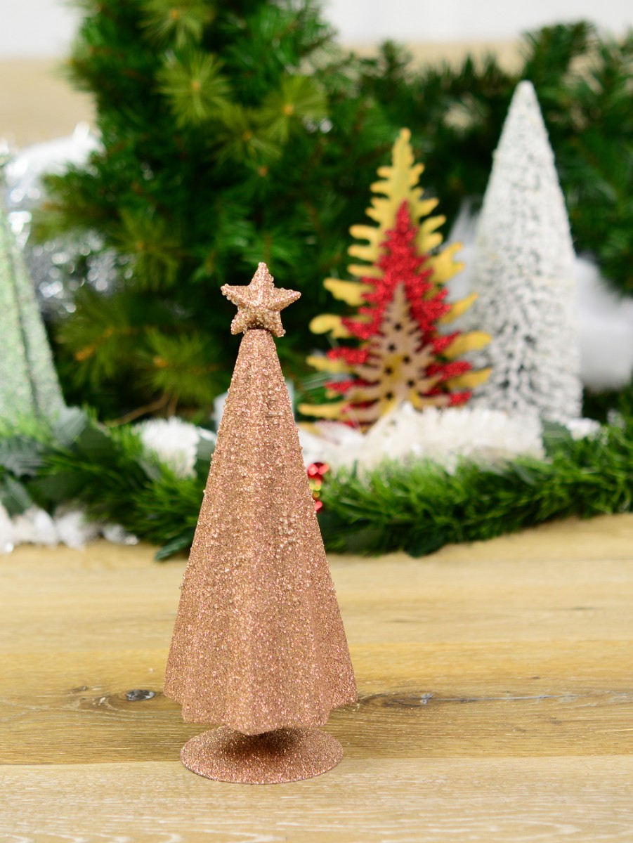 This table top Christmas ornament is crafted to look like a Christmas tree with a distinct umbrella-like cone shape. At the top of the cone is affixed a huge star topper which simulates an artificial star ornament that is encrusted with pearls and glitters. Even the conical shaped tree displays this same simulation of an actual Christmas tree that is adorned with pearls and baubles.
