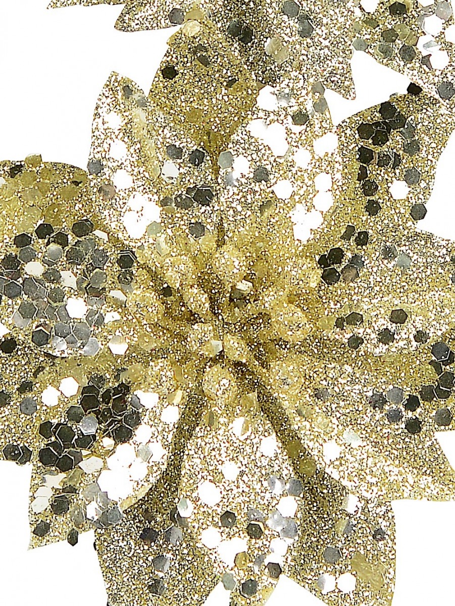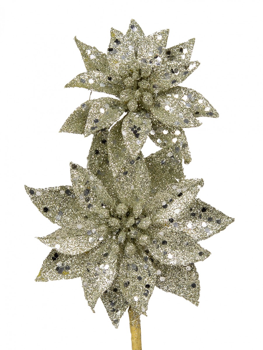 This 30 centimetres long platinum coloured poinsettia glittered pick is a testament to how creative a master craftsman can be. Two poinsettia flowers share the same stem and colourful brilliance but are of differing size. The flower below is much larger than the one at the top just like the typical plant. The unusual choice of platinum palette gives it its opulent look. This pick would blend in perfectly with every interior and exterior decoration you might be planning for this Xmas. It would look amazing on your evergreen Christmas tree while the dazzling Christmas lights casts a beautifully reflected glow on it. You can't afford to miss out on this platinum pick, so, place your order while we still have it in stock.
