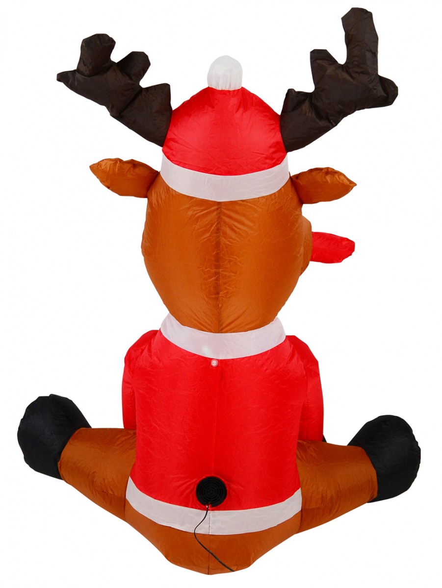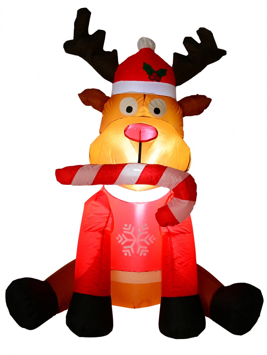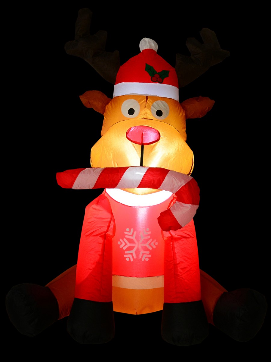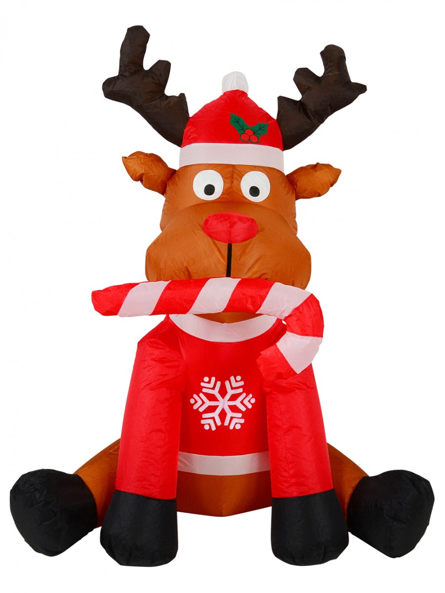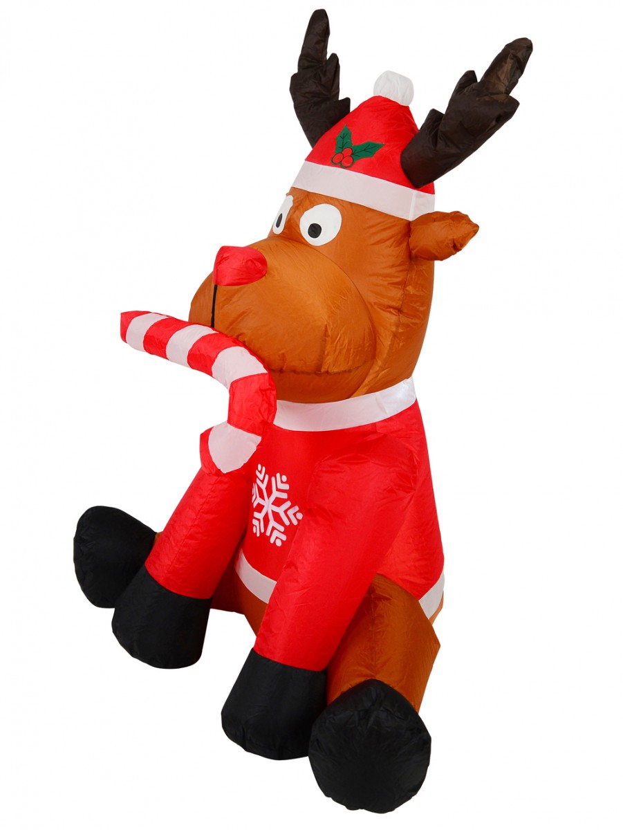 Santa has nine reindeers who take him to wherever in the world he wants to go. One of the most notable of these reindeers is Rudolph - the candy lover. Through the use of this pretty Christmas inflatable, Rudolph is seen sitting down like a gentle dog while he's got a candy cane in his mouth. He is shown as wearing a red jacket that is ornamented with white coloured snowflakes image over his brown fur. He also wears a red Santa hat and bites on to a red and white candy cane. The red hat has a pom pom and the decorated motif of berries.
