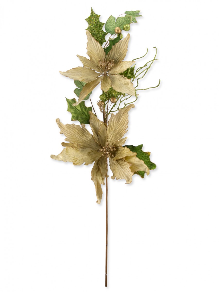 The legend of the poinsettia begins in Mexico with two children named Maria and Pablo. Their family was very poor, but nevertheless looked forward to the annual Christmas festival in their town. Their little village was filled with Christmas decorations at this joyous time of year. A favourite was the manger scene at the village church. Maria and Pablo were saddened because they had no money to buy Christmas presents for anyone. They dreamed of giving a gift to the village church for the baby Jesus. One Christmas Eve, Maria and Pablo went to church to attend a special service. As they walked to church empty-handed, they decided to pick weeds in shades of green that were growing alongside the road. They planned to present these to the baby Jesus in the church manger scene as their humble gift. Upon arriving at church and seeing all of the beautiful Christmas decorations, Maria and Pablo placed their green leaves around the manger. The other children laughed at them until the green leaves miraculously turned into bright red petals. Breathtaking flowers that looked like bright red stars soon surrounded the manger. That is the legend of the poinsettia. This poinsettia pick is not bright red like the one in the legend, but an elegant champagne colour, featuring two flowers with berries, green leaves and twigs. Measuring 32cm x 10cm x 79cm , these unique Christmas decorations are set off by glitter highlights. A large bunch of the picks would make a stunning centrepiece for a formal dining room set or large conference room table. Bring some class to your home or business with these special poinsettias.