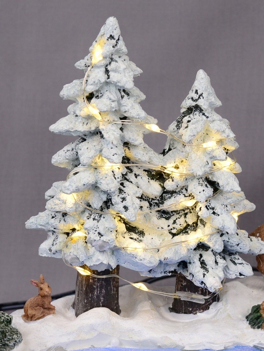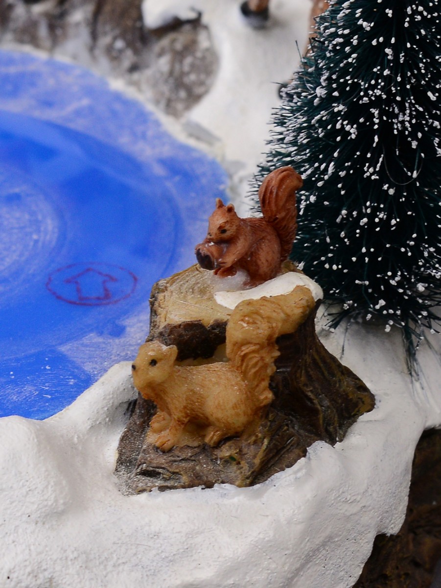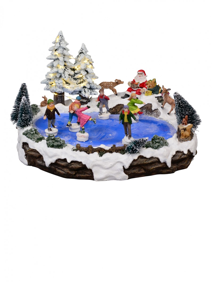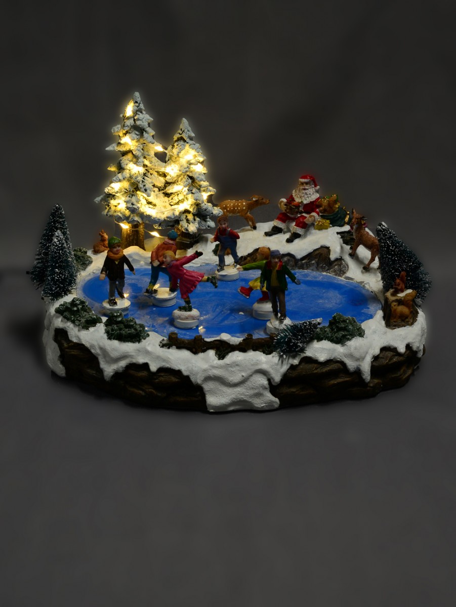 Your children will especially be fascinated with this finely finished, elaborately ornamented Pond Skating Christmas Scene With Santa, Reindeer & Christmas Critters. You will therefore never go wrong if you gift them this ornament as their Christmas gift. They certainly would be proud to decorate their room with it because it is a constant reminder that Santa loves them. Plus it doesn't have to be gifts for the children alone; it can also be incorporated into your Christmas decoration also. In this beautifully animated scene, Santa is seen sitting down while kids are having fun by skating over a frozen blue pond. In attendance at the party are Santa's reindeers, critters, squirrel and a rabbit.