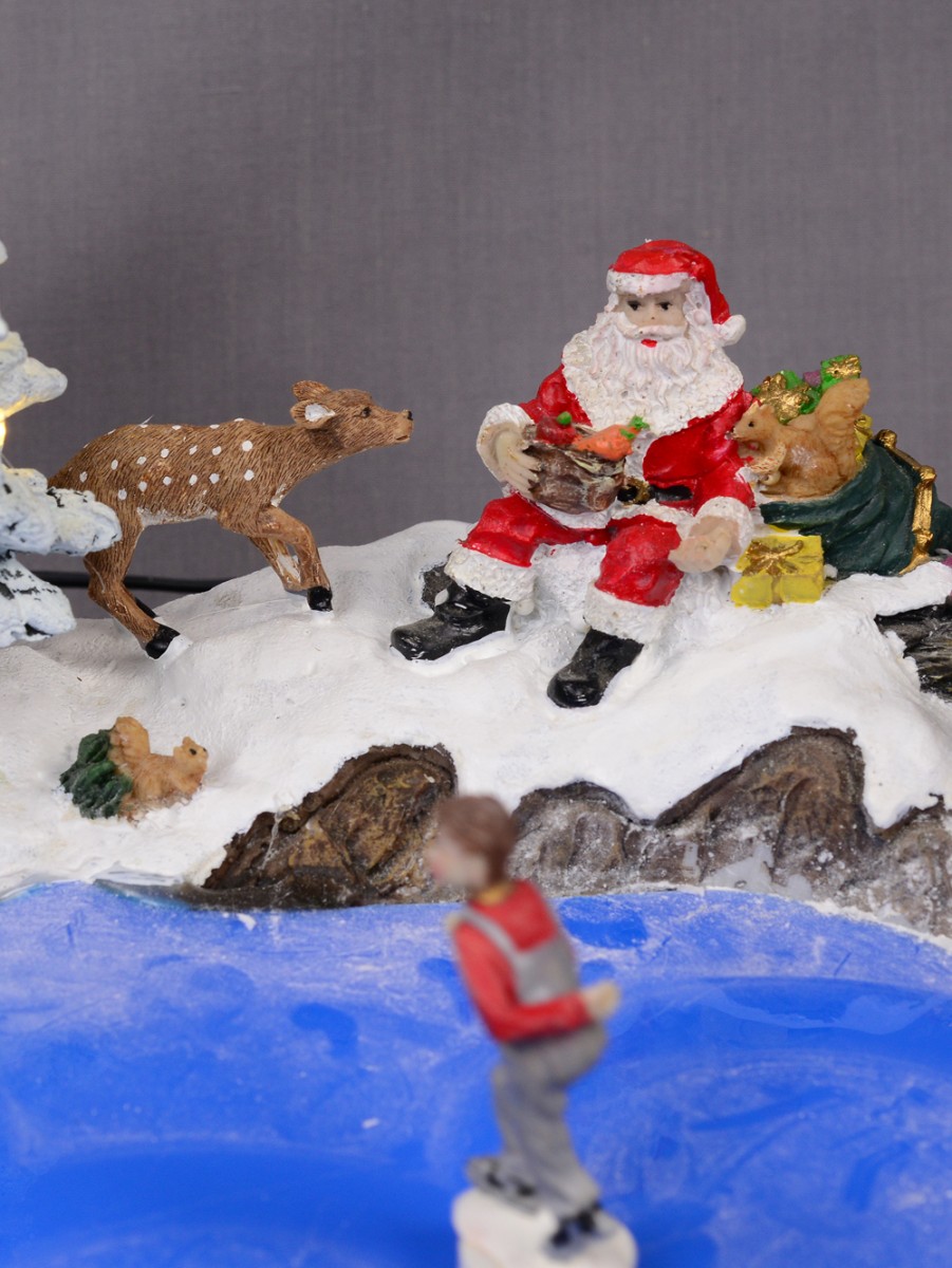 Santa shows his love of children through this visually captivating Pond Skating Christmas Scene With Santa, Reindeer & Christmas Critters ornament. Fashioned in a circular form with evenly flat base, it can be used for Christmas decorating purposes by placing it on any flat surface at home, office, shop or store. It doesn't require much space; all it needs is just 33 centimetres of your table top.
