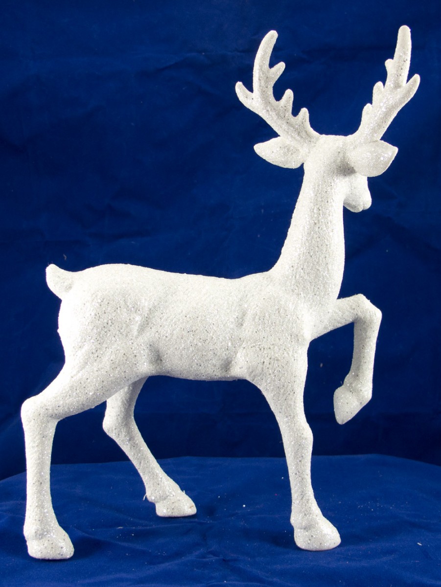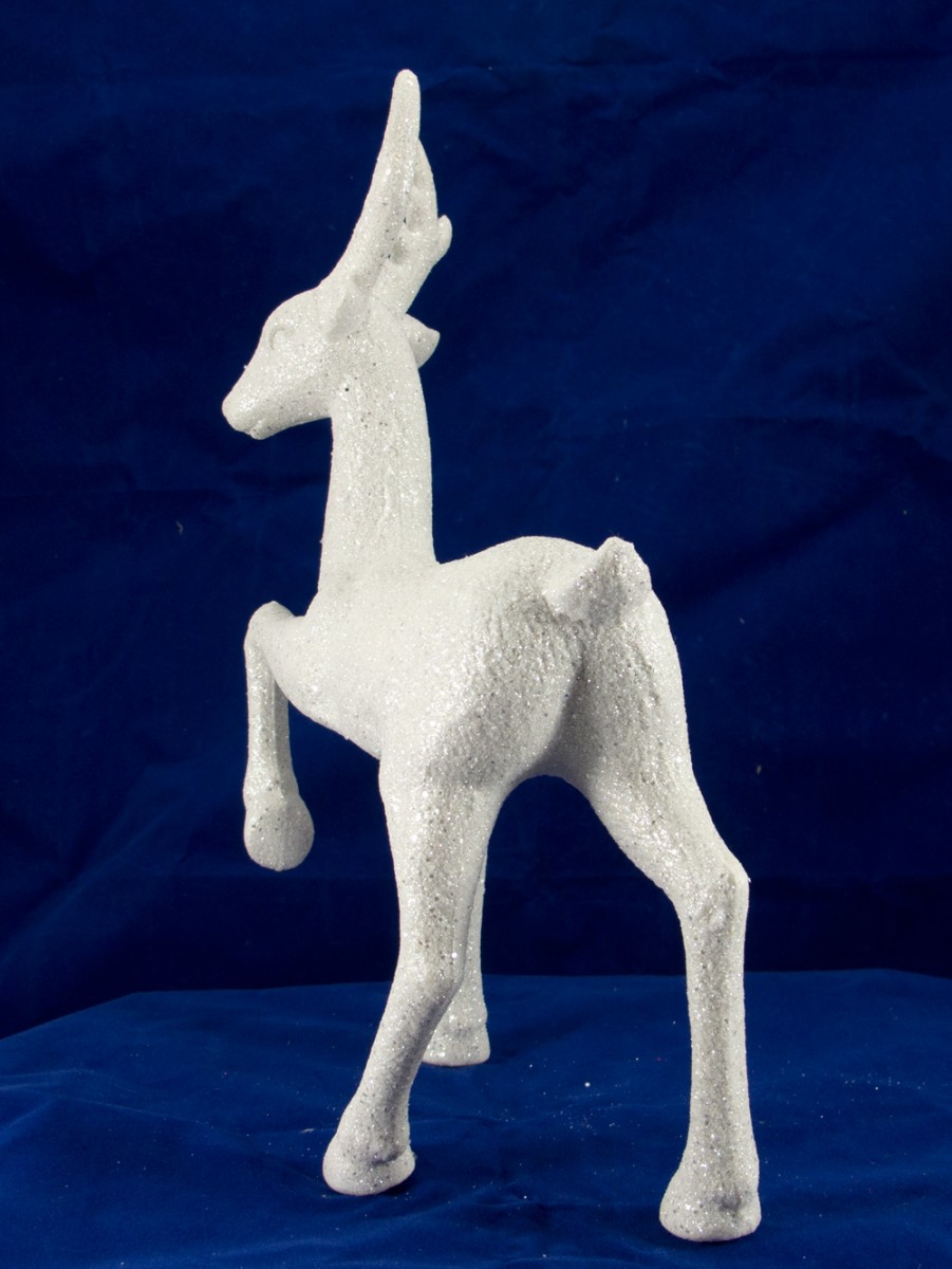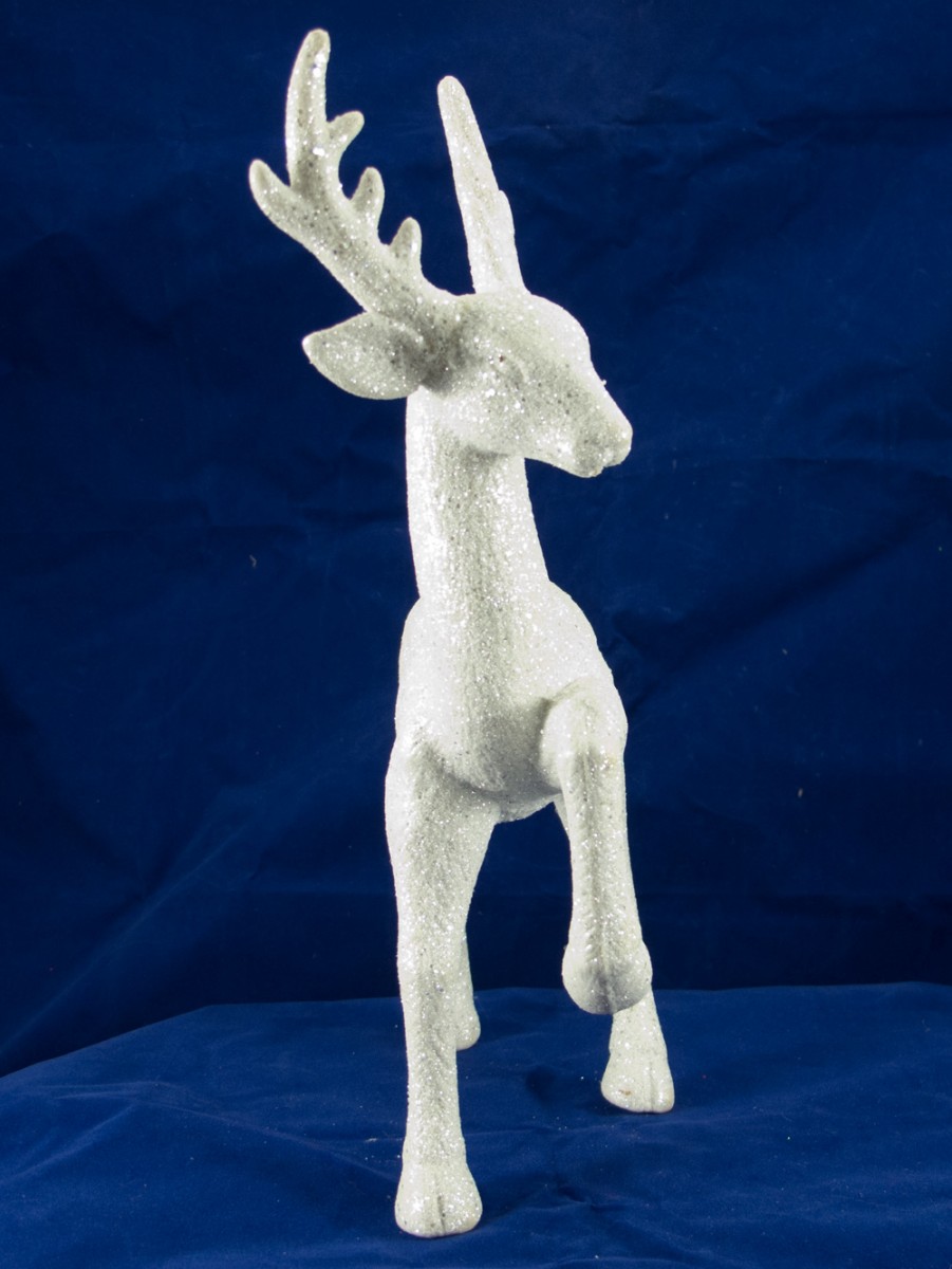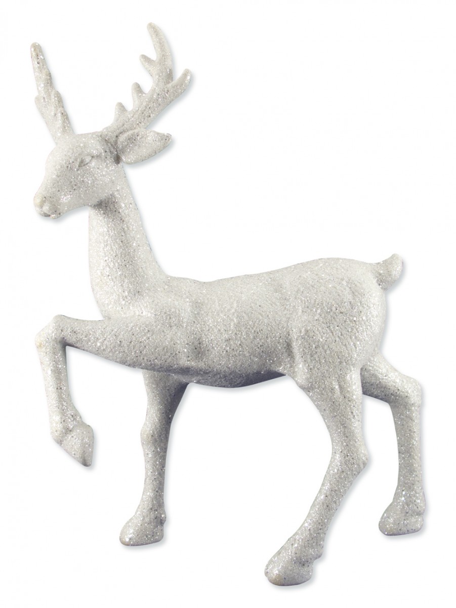 There's a special type of beauty associated with reindeer and thanks to Santa and his herd of helpful reindeer pulling his sleigh, they're even more prevalent during the holiday season. Their images are found on a variety of Christmas decor from ornaments to linens. This beautiful Prancing Glittered Reindeer is white and covered with silver and iridescent glitter from the tip of his antlers and down to his tail. His left front leg is bent in prancing formation. At 28cm, he's ideal to put in a variety of spots around your home including under the Christmas tree, on a shelf or as part of your centerpiece. Thanks to the white color with hints of silver, it can complement a variety of styles, themes and colors of holiday d�cor from traditional red and green to modern silver, black and white. This little guy is sure to get you plenty of compliments throughout the holiday season.