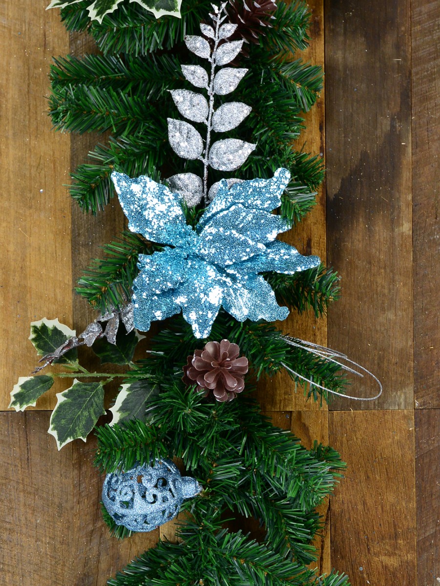 • Blue, silver & turquoise pine garland with poinsettia, berries & foliage decorations