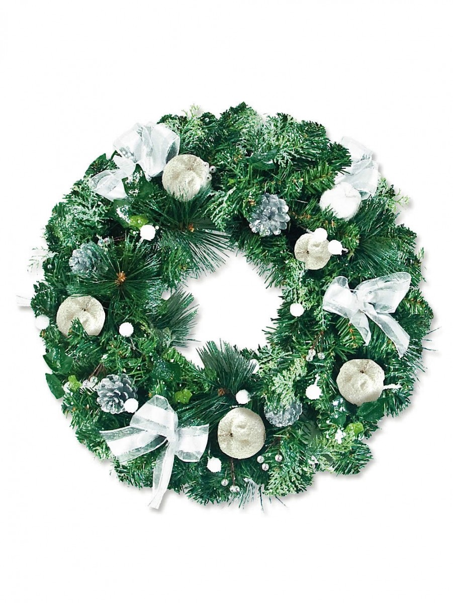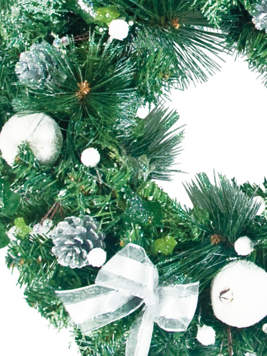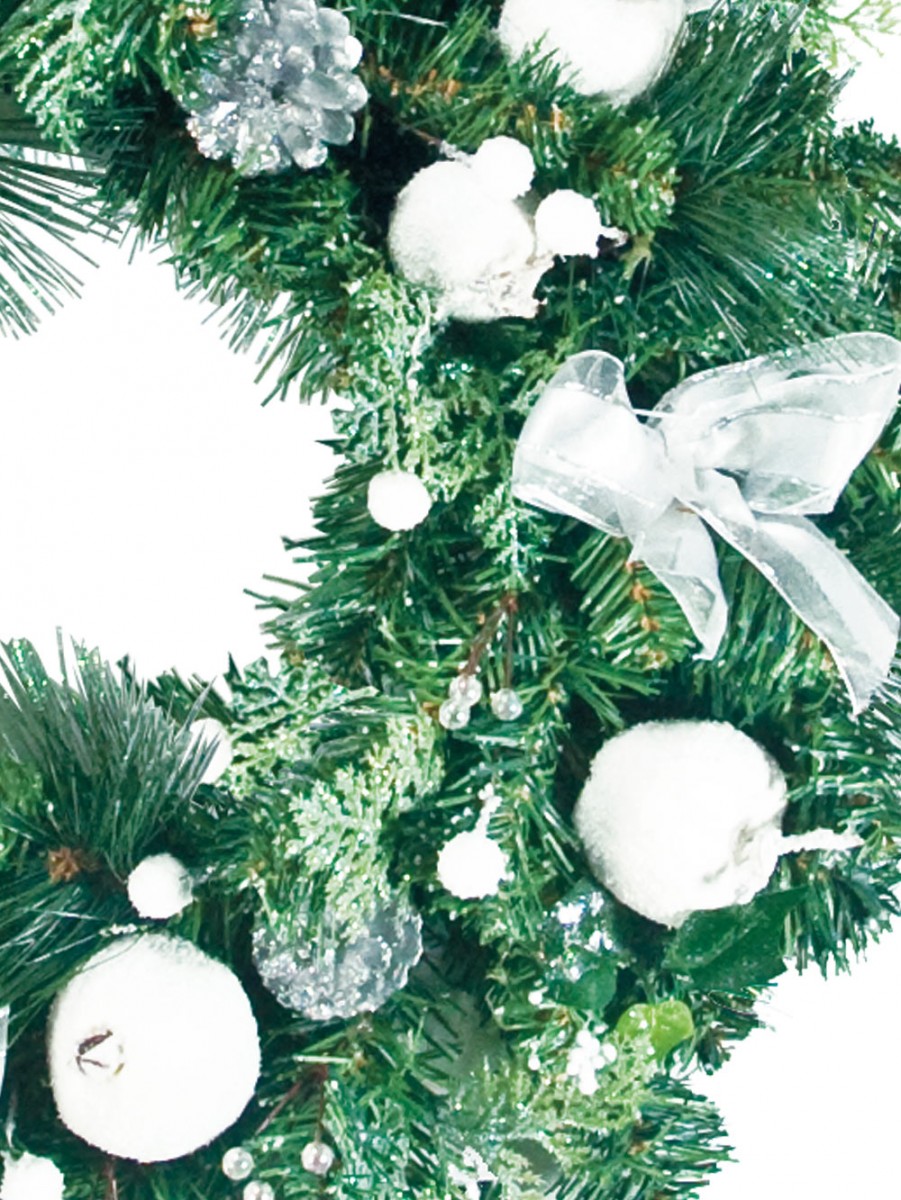 Are you dreaming of a white Christmas but you don't experience the snow and cold climate which comes with it? If so, you should consider getting the Pre-Decorated Frosted Wreath With Pine Cones, Fruit Cedar & Bow - 44cm. This amazing wreath is made of a thick garland of different kinds of pine. You can see that there are various types of pine needles, thin and sharp to fat and full. The varying shades of green on the wreath give the wreath a more natural appearance. The pine needles were made to look as if these were tipped with snow. All the decoration randomly positioned around the wreath are in white or silver. There are beautiful tiny apples, painted white and then glossed with silver. Inch-thick white ribbons with see through silver borders are tied into bows. Dried pine cones are sprayed with silver as well. Finally, you will see white berries and crystal-like beads positioned randomly. Hanging this beautiful Christmas wreath on your door or elsewhere in your home will surely make you feel as if you are spending this festive occasion near snow capped mountains despite not being actually there.