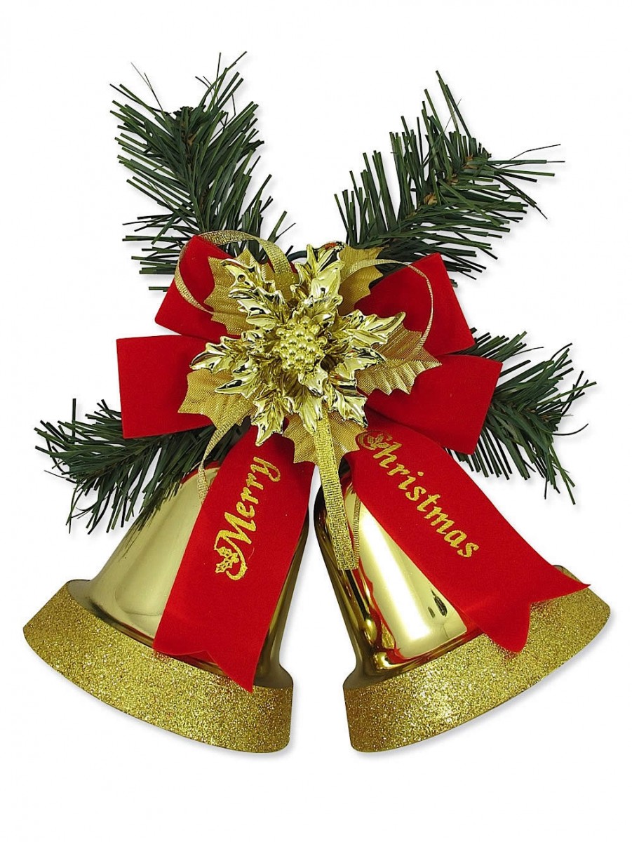 These decorative bells are all dressed up and ready to go in your home this holiday season. The two large plastic golden bells measure 10cm in diameter and have rims bedecked in glitter. The bells are adorned with evergreen accents and a red velvet bow reading 'Merry Christmas.' Gold ribbons and decorations fill the velvet bow, accenting the piece with metallic shine. This bell cluster is a perfect accent item for home decoration. The entire piece measures 21cm x 11cm x 35cm, making this piece a fantastic size to hang from any door or wall. Hang it up to welcome your guests into your home, or to bring Christmas cheer to any room of your house. The joyous symbol of the bells is sure to put smiles on the faces of your friends and families. Decorating your home for the holiday season is one of the most fun, and easiest, to help you and your family tap into the Christmas spirit. The Christmas Warehouse has everything you need to decorate your home for the holidays. From Christmas trees, to stockings, to twinkling lights, the Christmas Warehouse has it all.