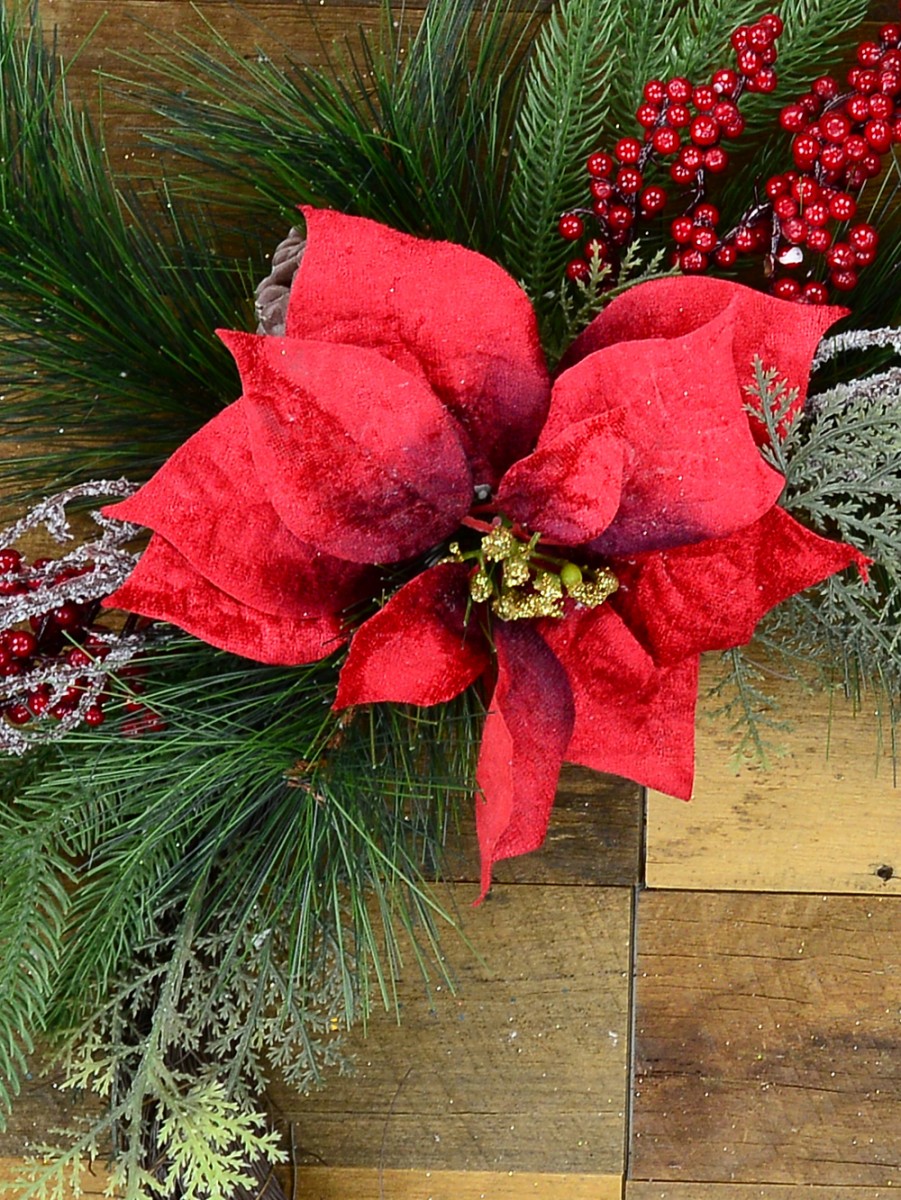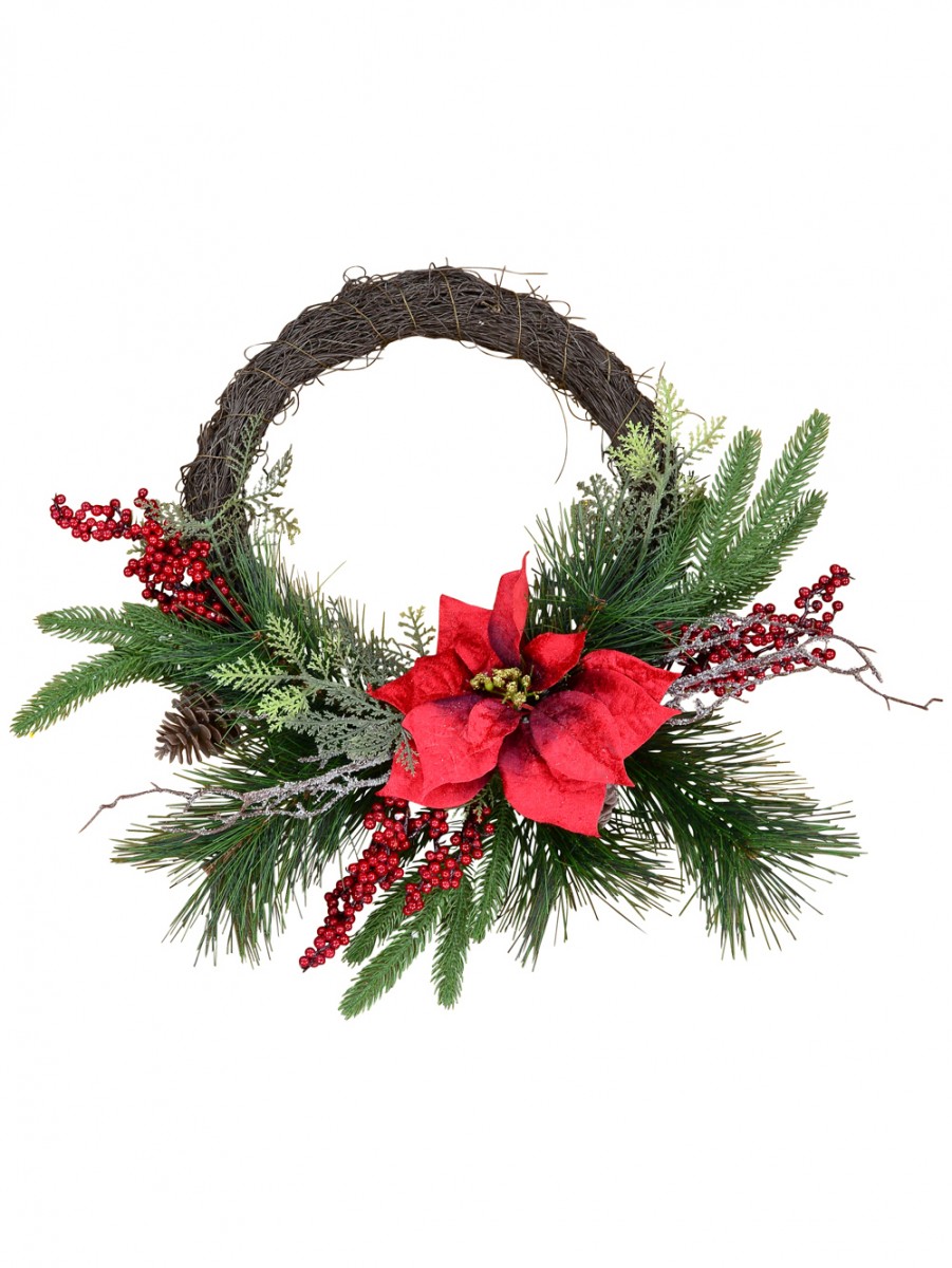 The Pre-Decorated Wire Spun Wreath With Mixed Foliage & Red Poinsettia is an exceptionally colourful wreath typical of a country decor and outlook achieved through the weaving of wire and several other colourful foliage which are varied twigs from familiar Evergreen Christmas trees. The woven wreath comes pre-decorated with Christmas ornamental items such as the traditional Christmas flower of red poinsettia which has gold coloured flowering buds at the centre and berries. The foliage/twigs are in several shades of green inclusive of mint green, forest green, pine green, and Sacramento green. There are a lot of decorative uses that this wreath can be used for depending on that which appeals to your decorative sense.