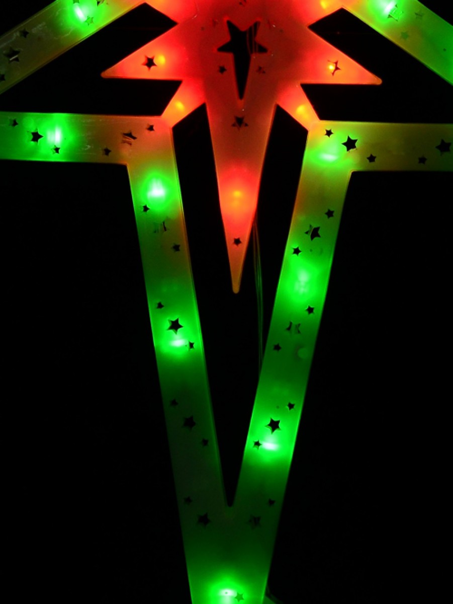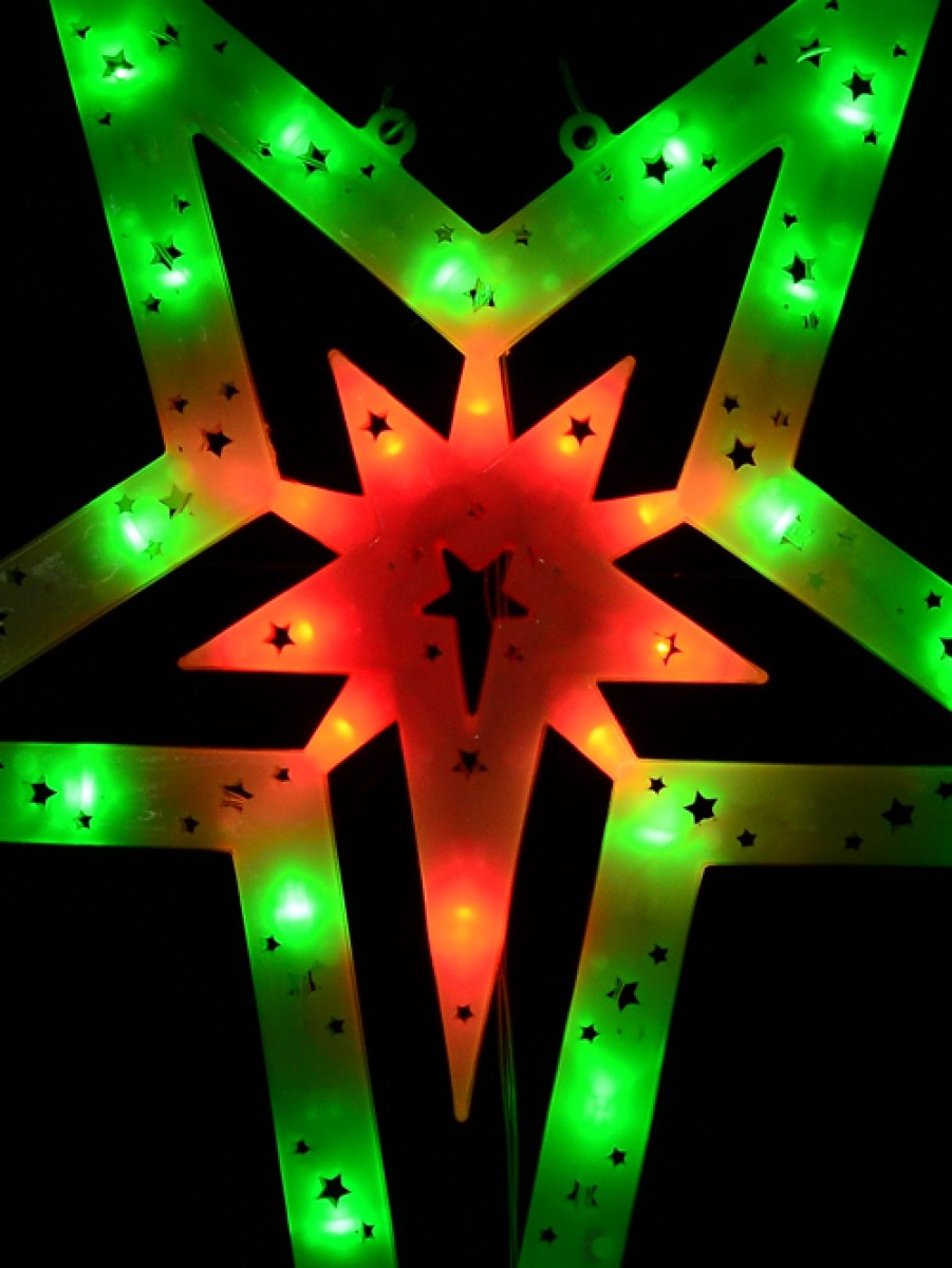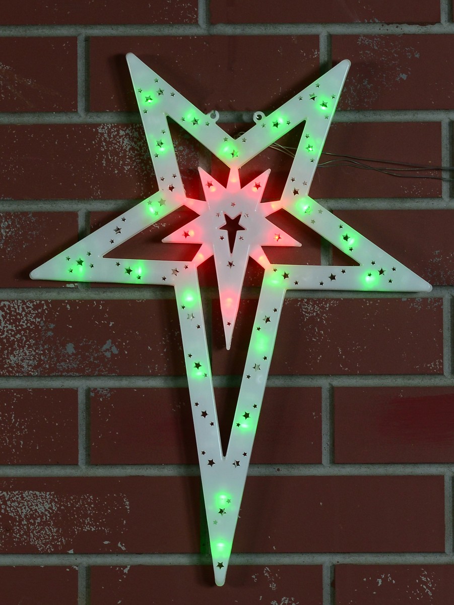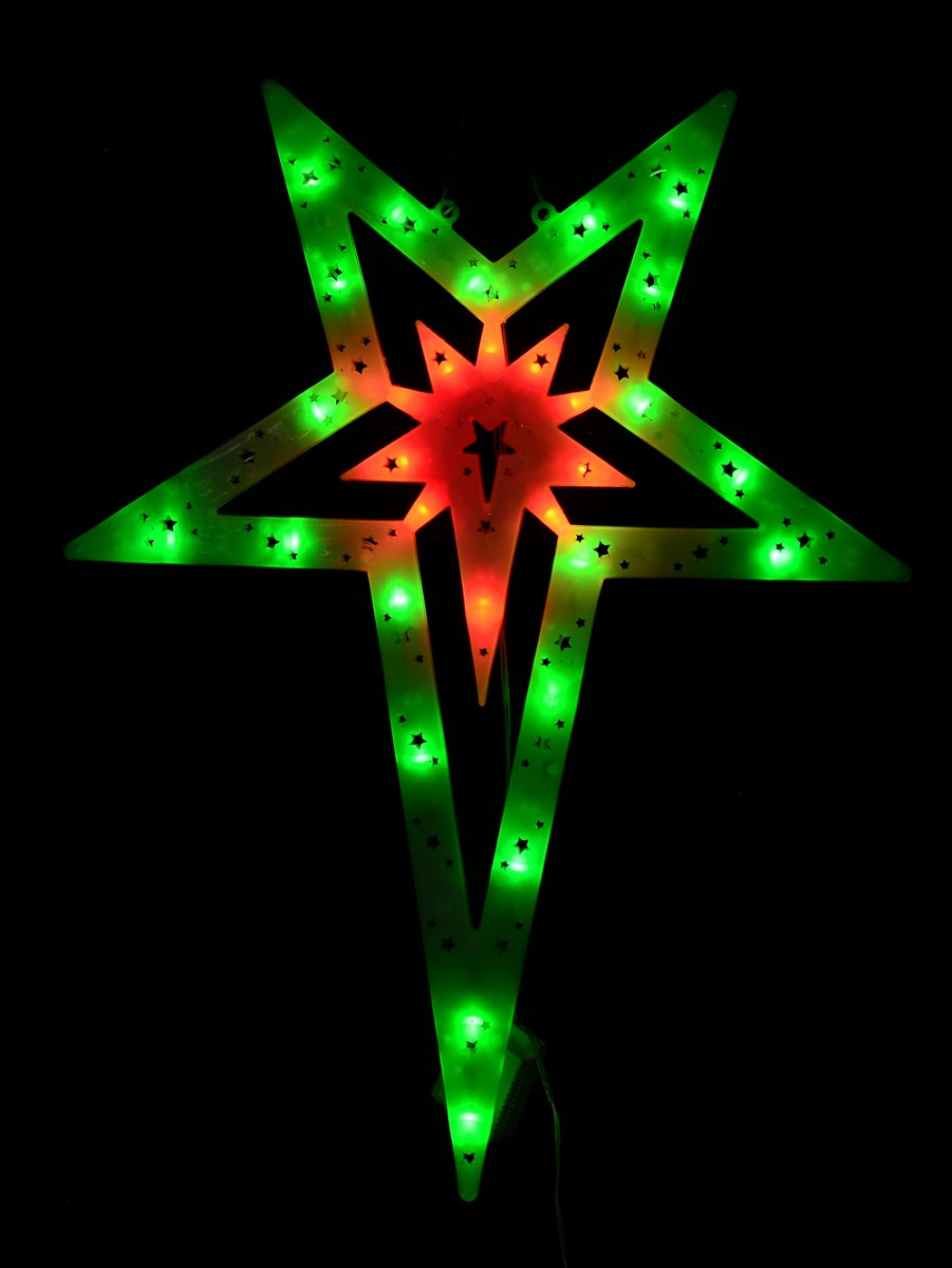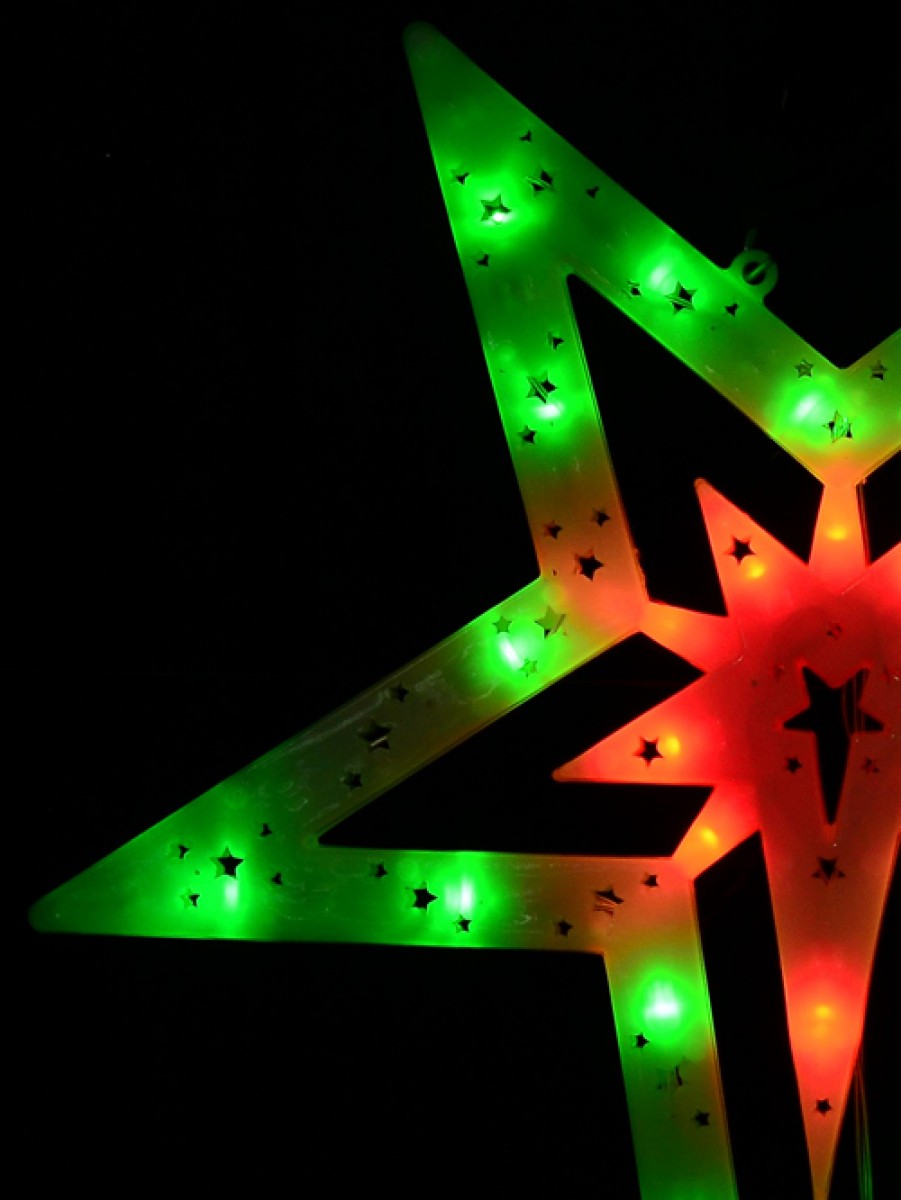 When one thinks of Christmas, the colours red, green and white aren't too far from their mind. Red and green lights are almost synonymous with Christmas. That's what makes this red and green 5-point Bethlehem star of the nativity motif so special for this festive season. Reminiscent of every Christmas-celebrating home during the early 2000s, this star display includes 30 green and red LED concave bulbs. Eachbulbs is spaced at an equal distance of 10 cm from one another for uniform perfect illumination. The 5-point star silhouette casing has different-sized star-shaped cuts to allow light to shine through in an uninterrupted manner. This star comes with two loops for easy hanging and display, along with a unique features function controller for 8 flashing sequences including chasing, twinkle & static illumination. Get one of these decorations today!