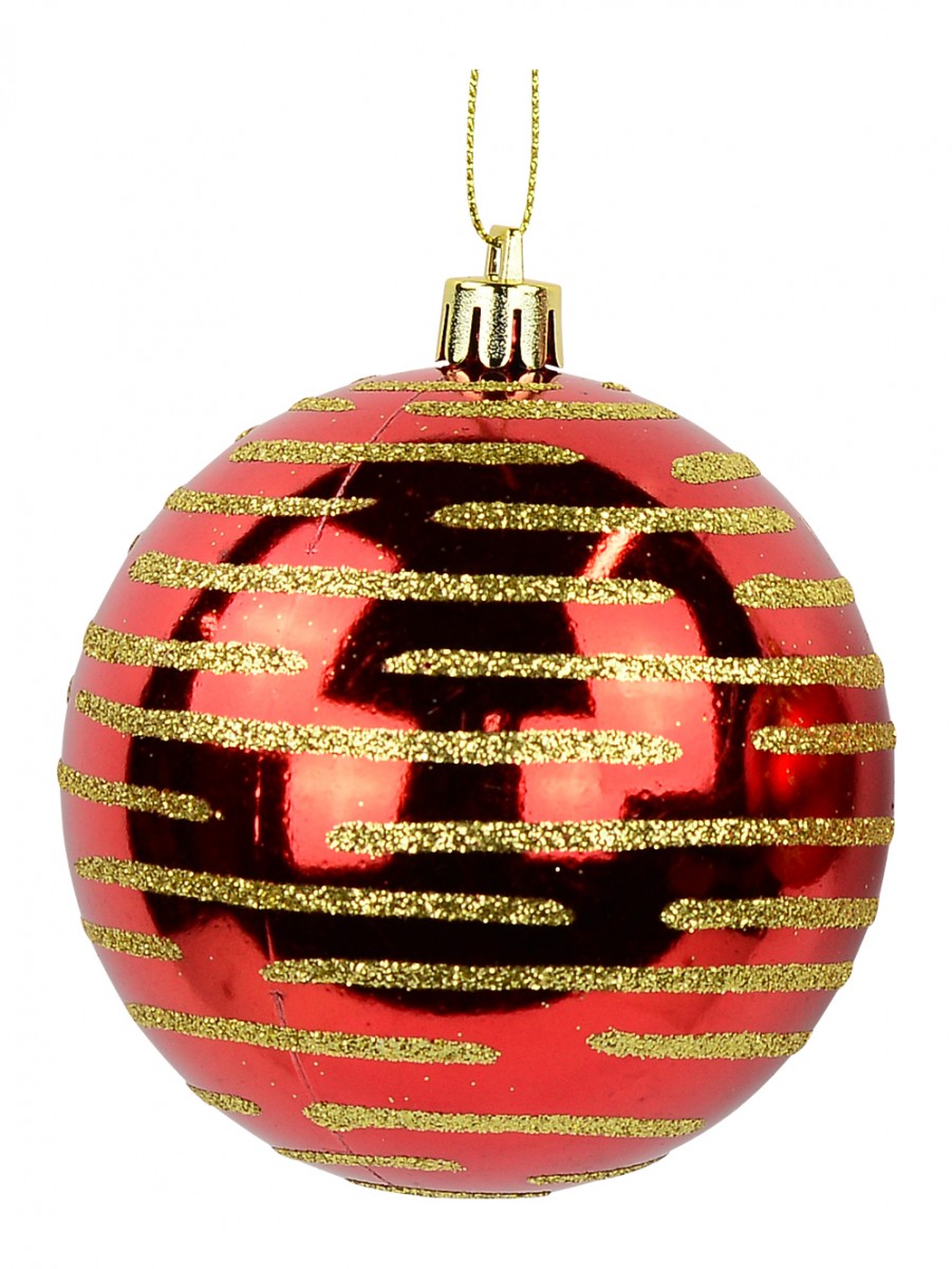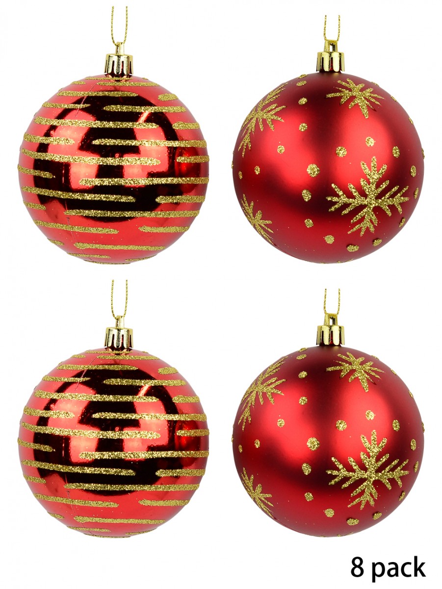 Add some colour and sparkle to your home with these pretty red baubles with gold glitter stripes and snowflake print that will stand out from the rest of your decorations filling the atmosphere with festive cheer! Featuring four baubles in glossy red colour with gold glitter semi stripes and four red matte baubles with gold glitter snowflake print, they are 8cm in dimension and sold as a pack of eight.