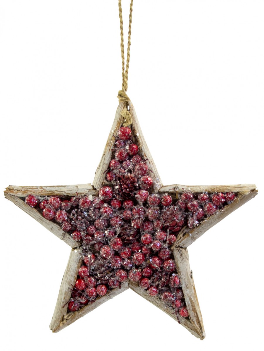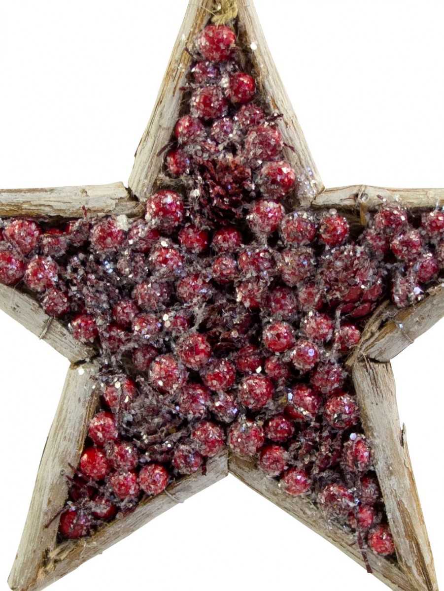 This hanging decoration will be the perfect fit for your rustic, country charm- filled Christmas decor. The red berries bring a lovely seasonal touch, and the accompanying �frosted� look gives an appealing hint at a winter wonderland. The wooden star frame is made from real tree wood to add to the decoration�s rustic charm. This decoration measures 24 cm x 30 cmm x 24 cm and is sold as an individual decoration. Buy one to hang on its own, or multiples to create a display on your walls! Comes with pre-attached twine for easy hanging.