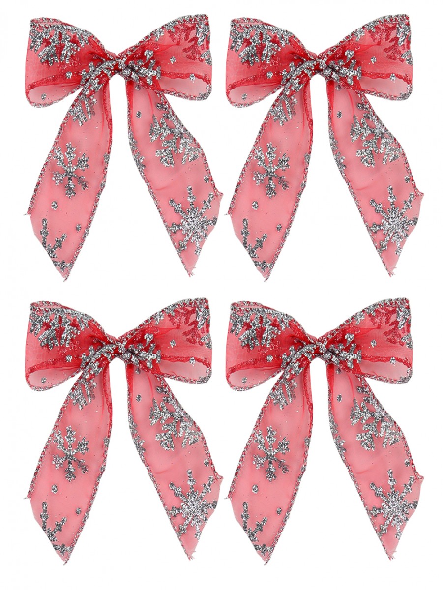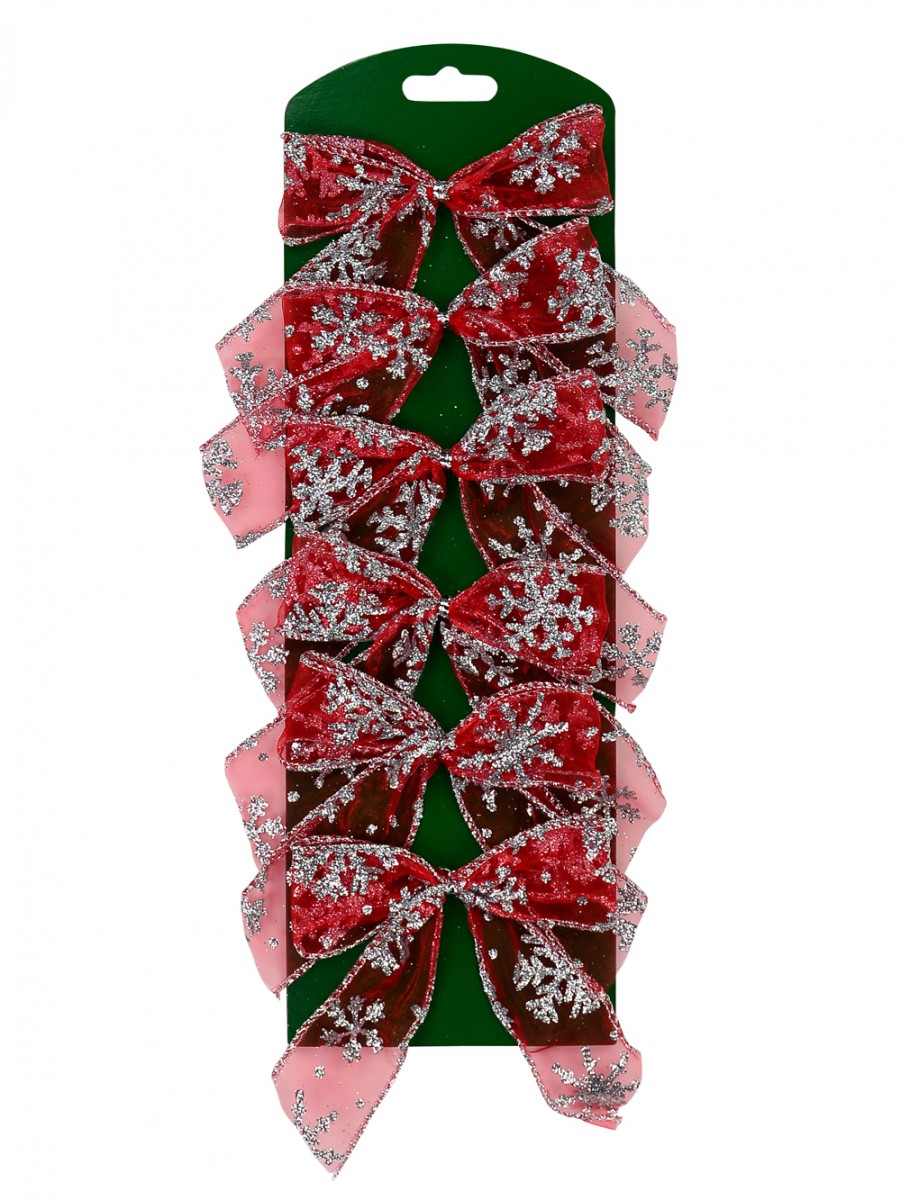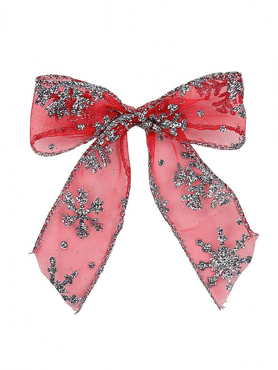 These six transparent red ribbon bows with silver glitter snowflake print are a versatile decoration that can be used to finish your festive table and are the perfect adornment for crafts, presents, favour bags and decor. With the eye-catching glittered detailing, they are guaranteed to bring a splash of colour to any festive celebration in style and perfect for creating charming decorations and even for accentuating personalised gifts.
