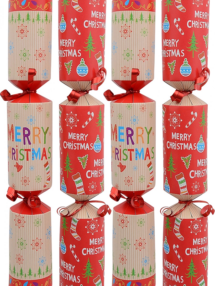 All fifty Christmas bon bons which are sold as part of this Red & Cream Snowflake & Decorations Christmas Cracker Bon Bons can be divided into two groups based on the difference in their ornamentation. Though they are all made in the same size, shape, and design, however, they differ in terms of colouration and ornamentation. The first group of crackers showcase a bright red backdrop over which are several Christmas motifs such as stockings, holly leaves, candy canes, snowflakes, baubles, Christmas trees and the festive greeting Merry Christmas. Over this are depicted similar Christmas motifs. Contained in each cracker are a snap, hat, gift, and joke.