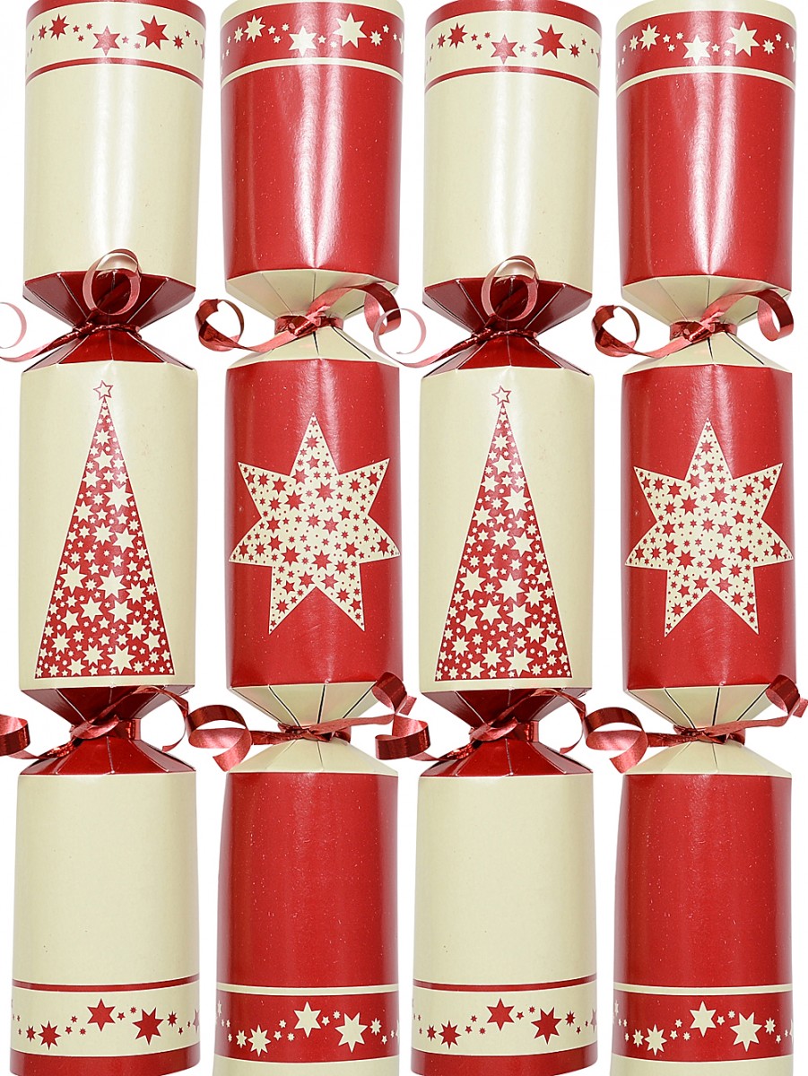 Imagine your family and friends gathered around the Christmas dinner table, eyes gleaming with delight as they reach for these delightfully designed crackers. Each bon bon is intricately adorned with either a cream background showcasing a red Christmas tree framed with delicate stars or a red backdrop adorned with a cream star, peppered with tiny red accents. The alternating patterns within the pack add a whimsical touch to your festive celebrations, making them an instant favourite.