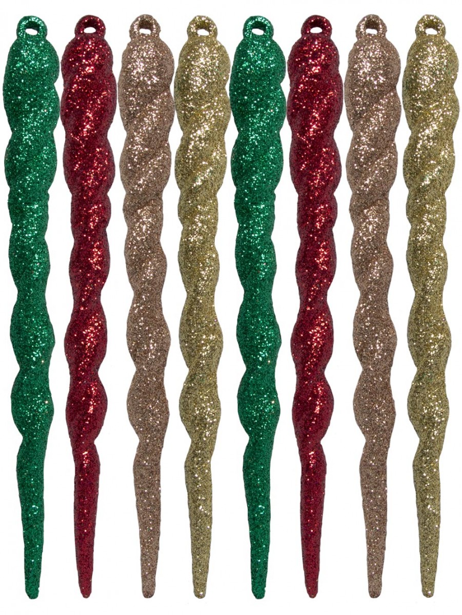 These Icicle Christmas decoration items are available in various assorted shimmery and glittery colour and design which includes - emerald, green, red and gold colours. These decorative items come in the shape of an icicle that is they look like roughly edged cylindrical structures. The dimension of these icicle Christmas decorations are 15mm x 13 cm and comes in a pack of 12, enough for decorating visibly in your Christmas tree. You can also hang them from your doors and windows to let everyone know that Christmas is here.