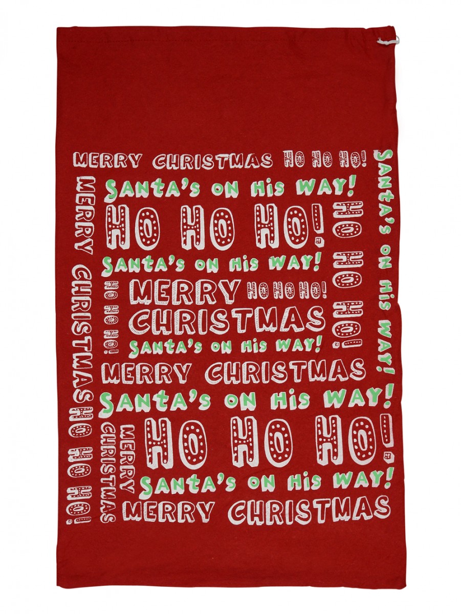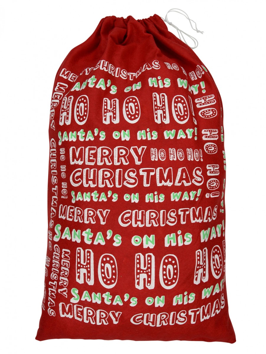 Deliver presents from Santa in this delightful Christmas Text Santa sack that is large enough to fit multiple toys and presents for all the good little boys and girls, nieces and nephews, grandkids, family members and pets, and also friends from around the world! The red felt present sack has "Merry Christmas, Santa's On His Way & Ho Ho Ho" written with no-sew appliqued Christmas text and can be easily closed by pulling the contrasting white drawstrings at the top.