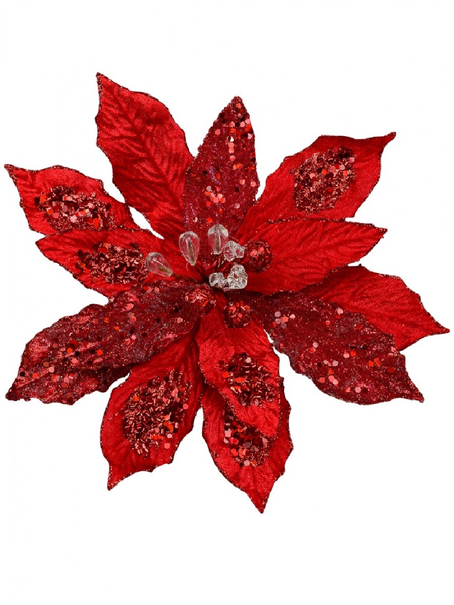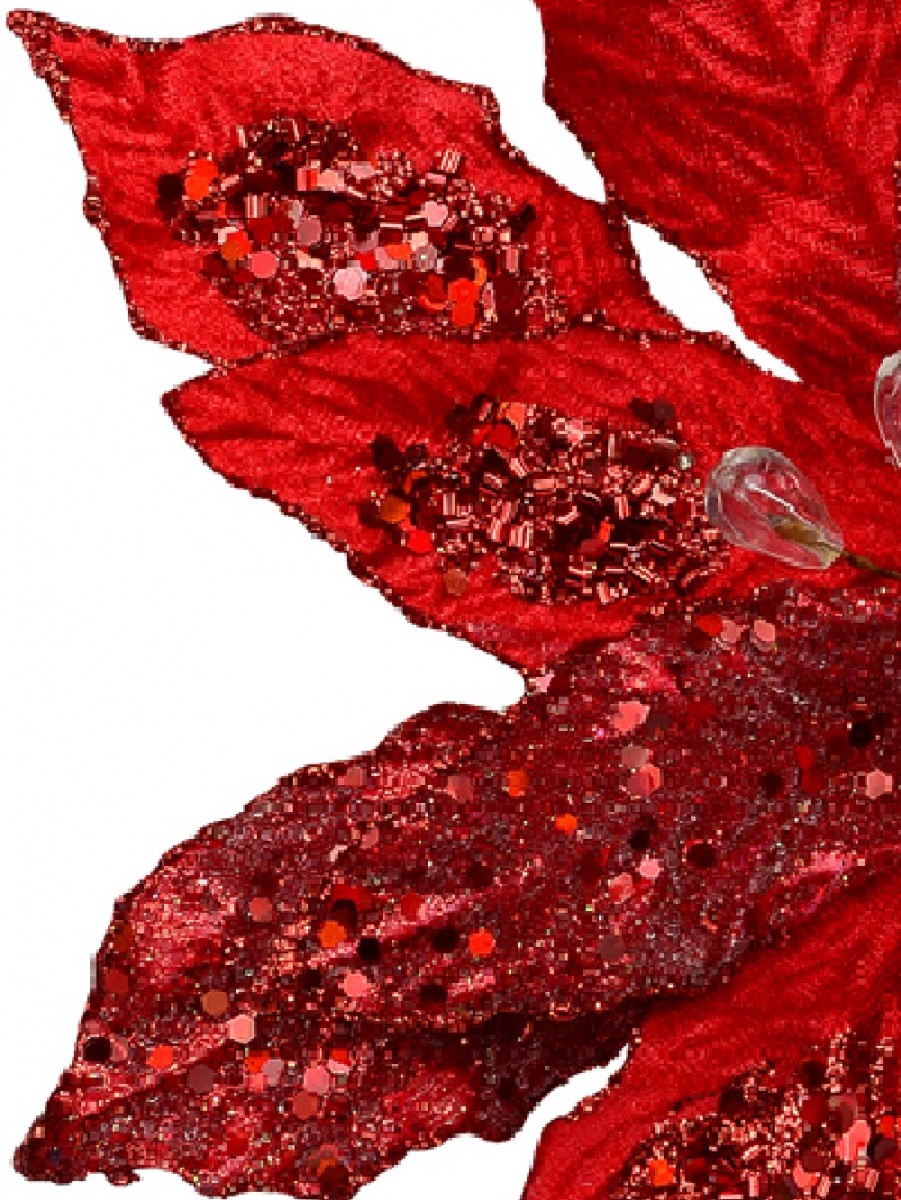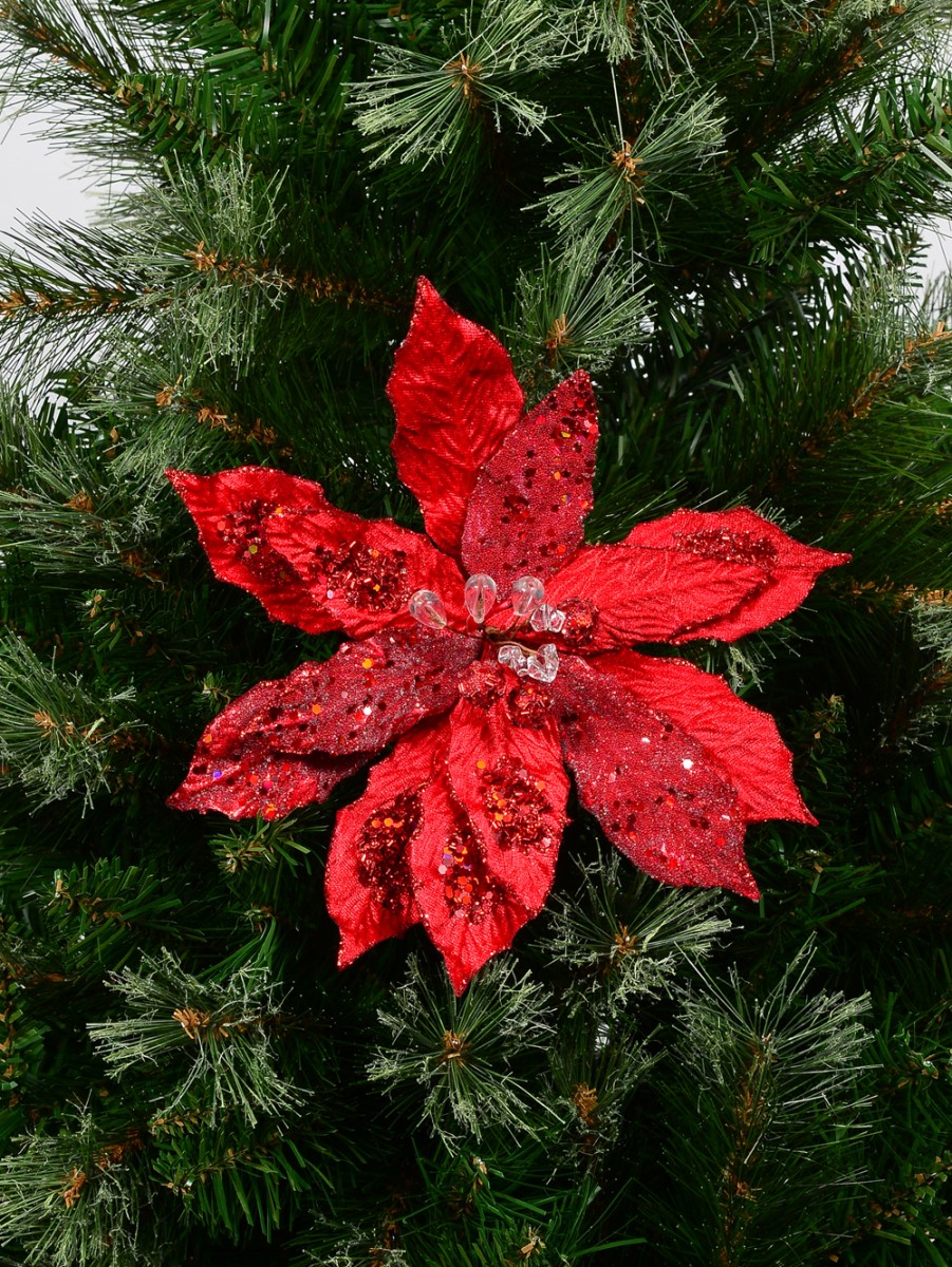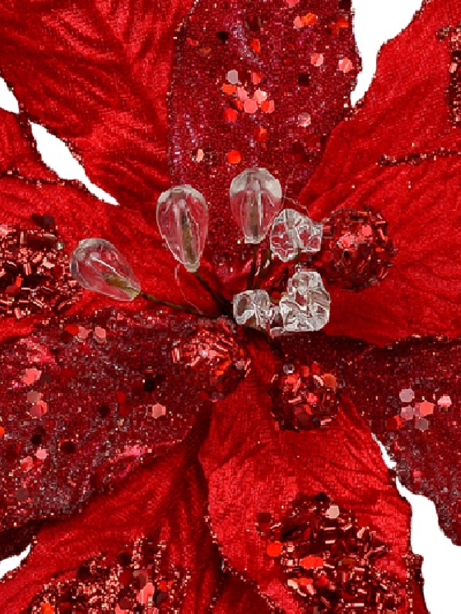 Who says red isn't a pretty colour? Simply show them this Red Felt & PVC Frosted Poinsettia Pick With Red & Clear Flower Buds and such person would realise just how fascinatingly beautiful the colour red can be. The beauty of the saturated red hue is further enhanced by the cluster of red spangles and glittering trims.