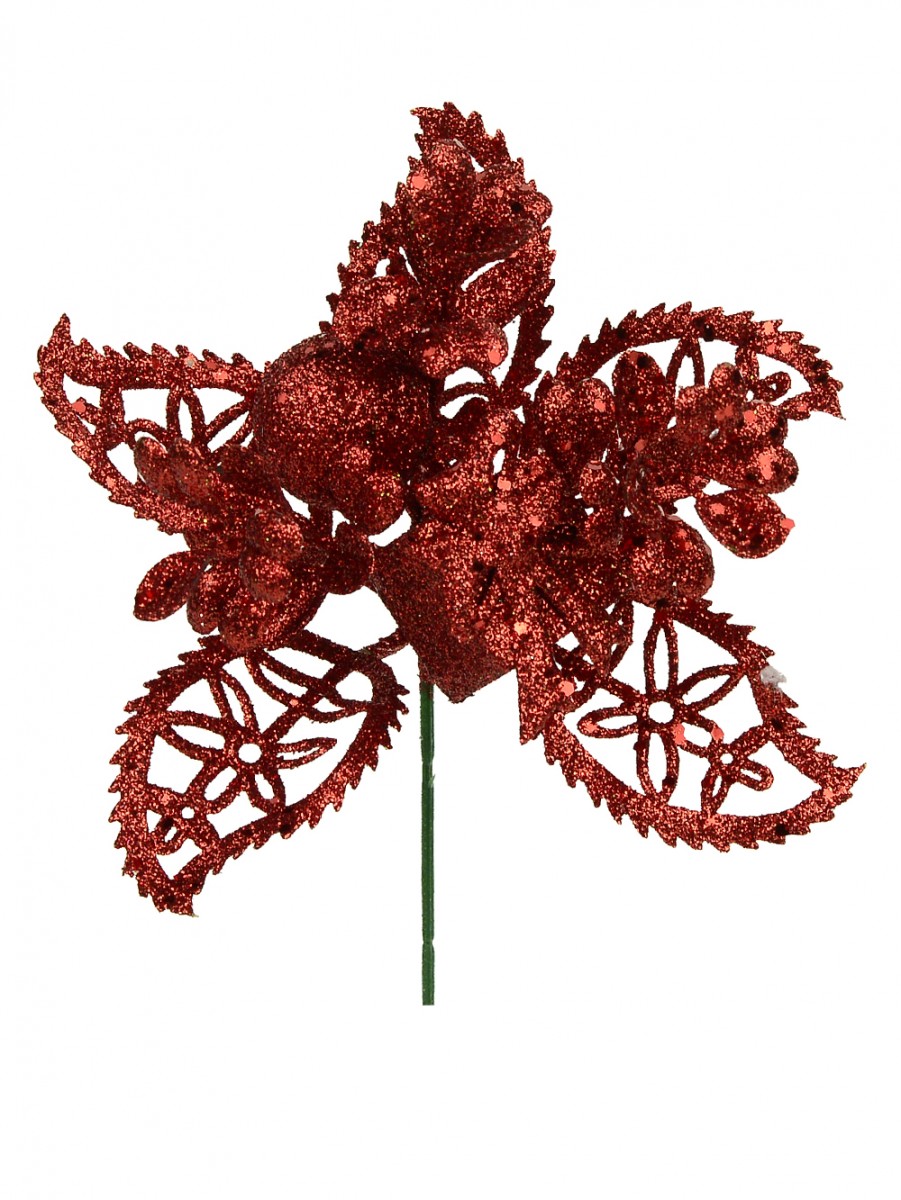 It makes for a fun and exciting tree ornament and you may simply add it to a vase with other flowers near the fireplace for a stylish look that will attract your guest's attention! Its contemporary design of red glittered filigree leaves and gift box embellished with sequins makes it a wonderfully versatile addition to your entire festive decor. The dimension of this product is 114cm x 12cm x 20cm with a short stem of 10cm for easy decorating. It is sold individually and you can get one wherever you are as it ships worldwide.