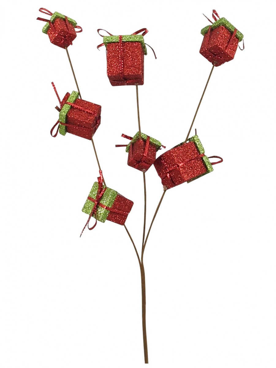 This particular decorative pick features charming little wrapped presents. The tiny presents are made of Styrofoam and wrapped in glittering gift-wrap on the end of holiday-red wires. The jolly presents are red foil-covered with green lids. Measuring 40cm high, the spray will work well on a wreath or wrapped around flowers. The metallic of the gifts shine beautifully against the natural elements of the evergreens. Opening presents, or watching others open presents on Christmas morning is one of the greatest joys of the holiday. Now you can add the charming element of holiday gifts in miniature form to your decorative sprays. These glittering packages will accent any wreath or arrangement with adorable charm. Combine them with other decorative pieces to create a beautiful and customized arrangement. The Christmas Warehouse has a large selection of picks and other floral accessories for your arranging needs. Additionally, the Christmas Warehouse carries a large stock of Christmas trees, lighting displays, decorative accents, ribbons statues and twinkle lights.