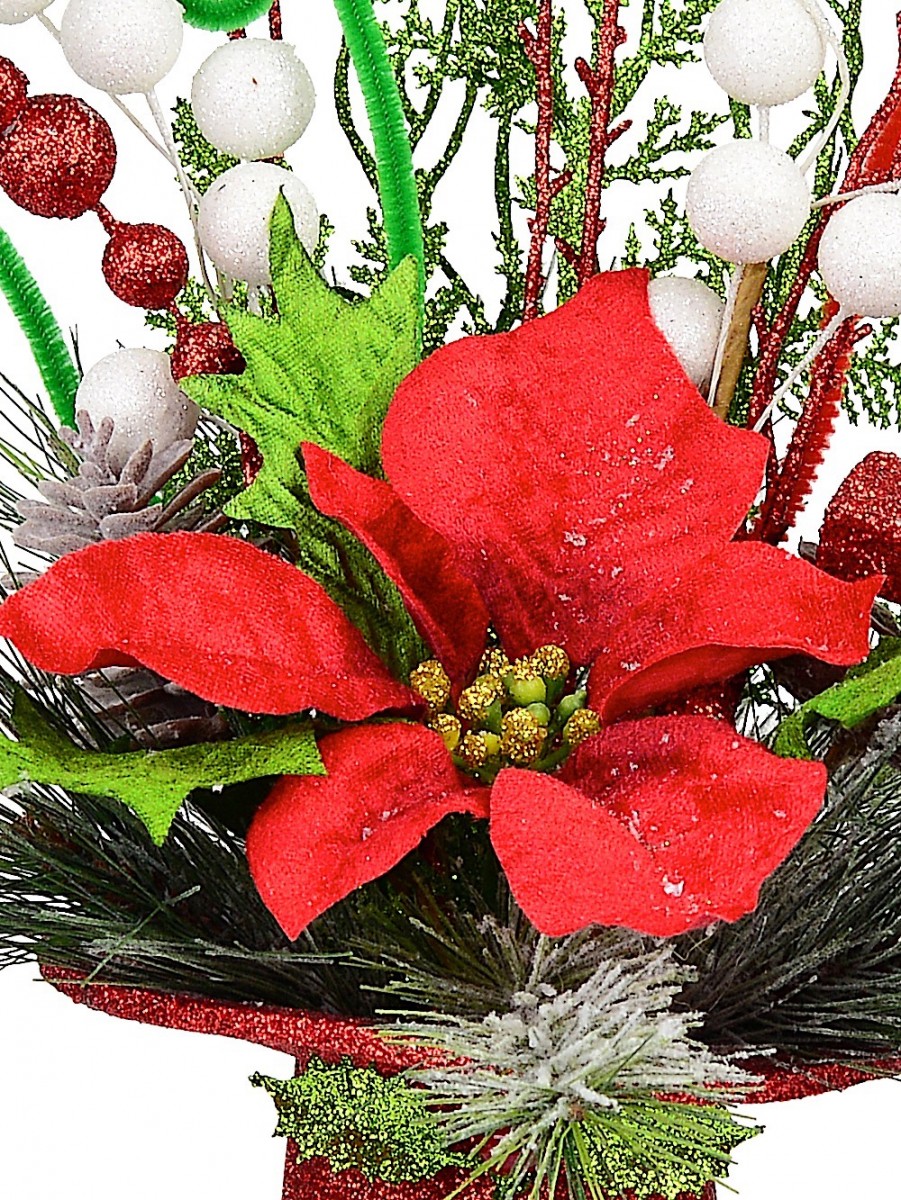 Our table decorations take out all the guesswork and hard work that goes into making your own arrangements with readymade, convenient yet beautifully designed holiday displays. This red glittered tabletop decoration with poinsettia is 40cm in height and will help elevate your home decor while also bringing the magic of Christmas alive!