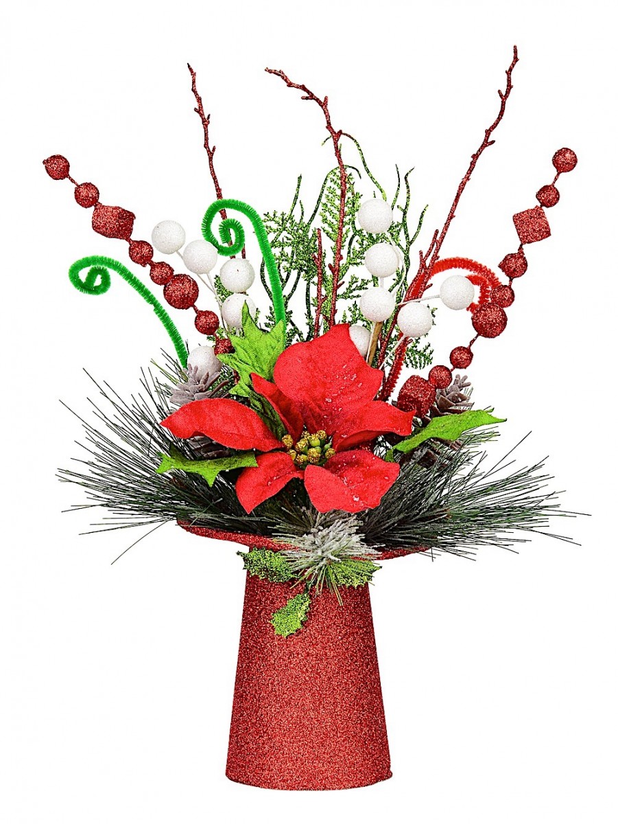 This holiday-themed arrangement has a bright red poinsettia in the middle and is filled with different holiday greens with whimsical green and red stakes, and berries as accents. The glittered red pot base narrows slightly towards the top with vibrant green holly leaves adorning the front side below the rim. This will make a great conversation piece and is perfect to place on any tabletop in your dining room, living room or bedroom. It will add extra charm as the attractive centrepiece on the mantle along with your other Christmas decorations and is preferably suitable for indoor decoration only.