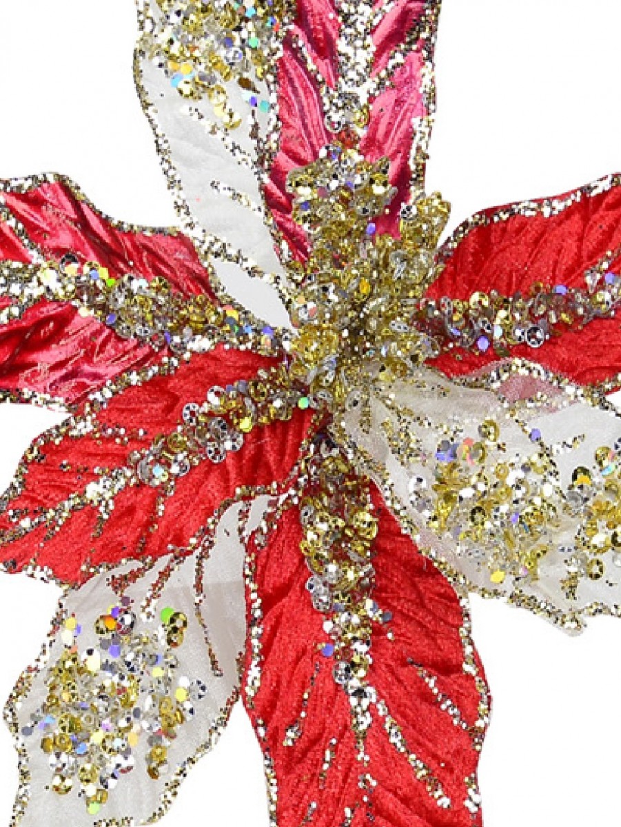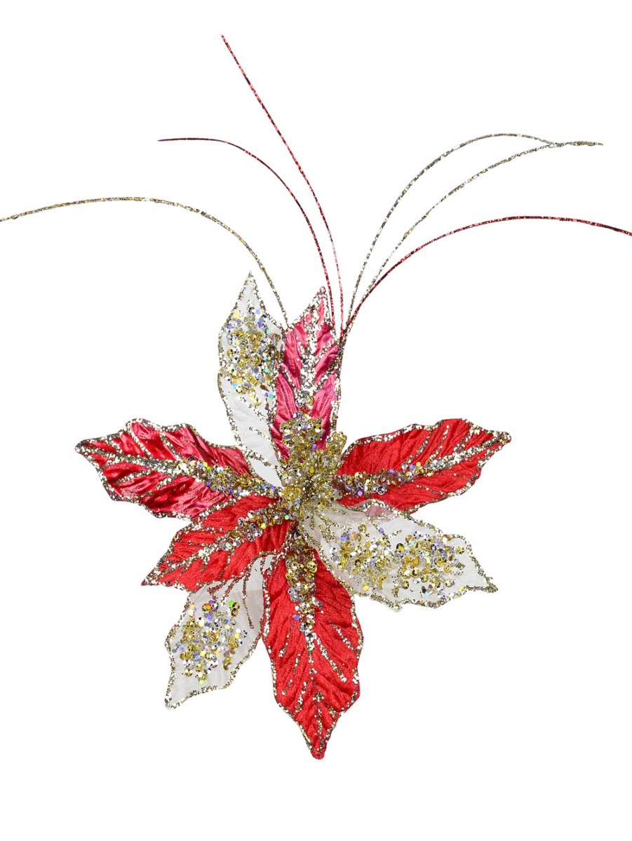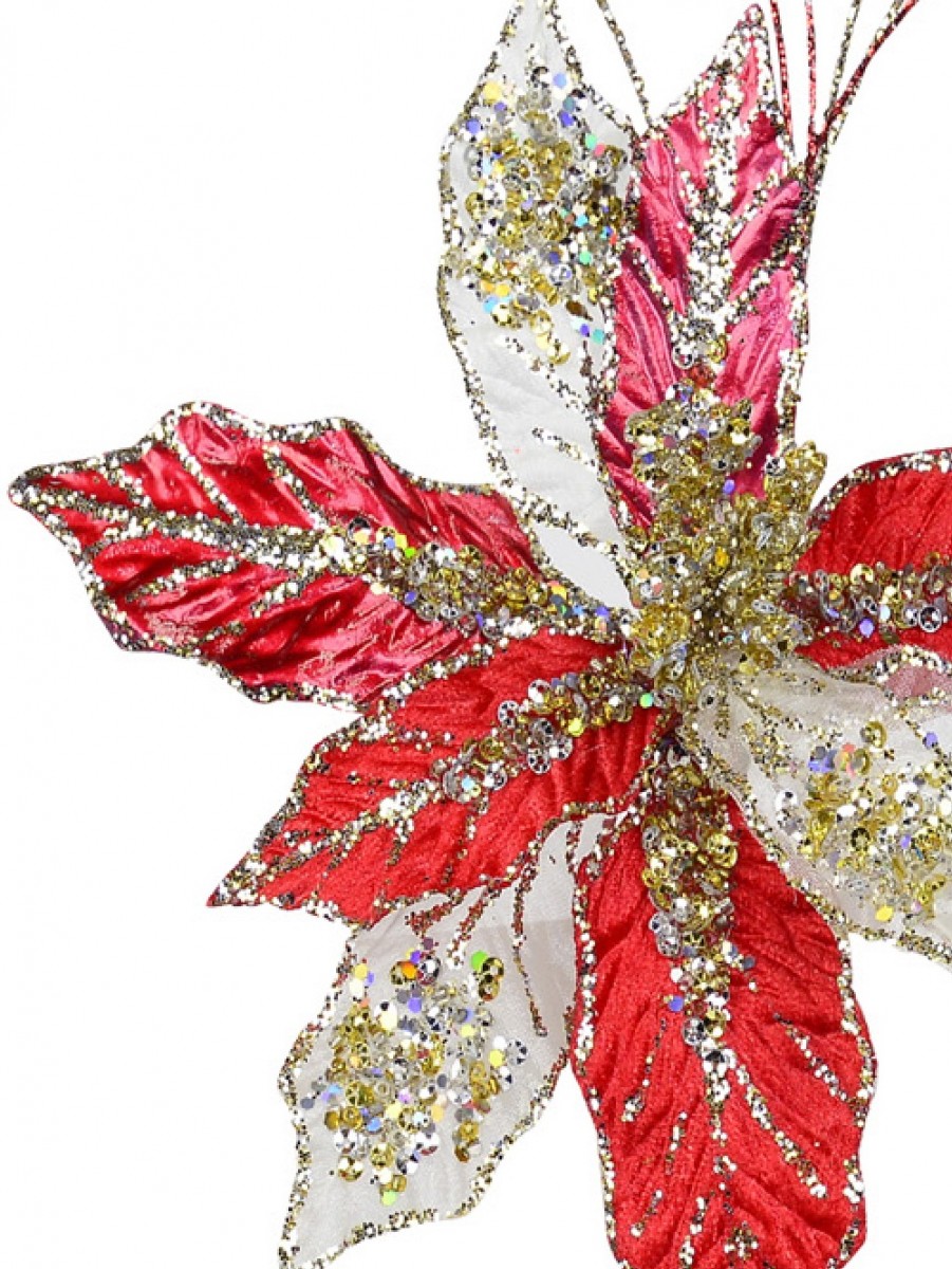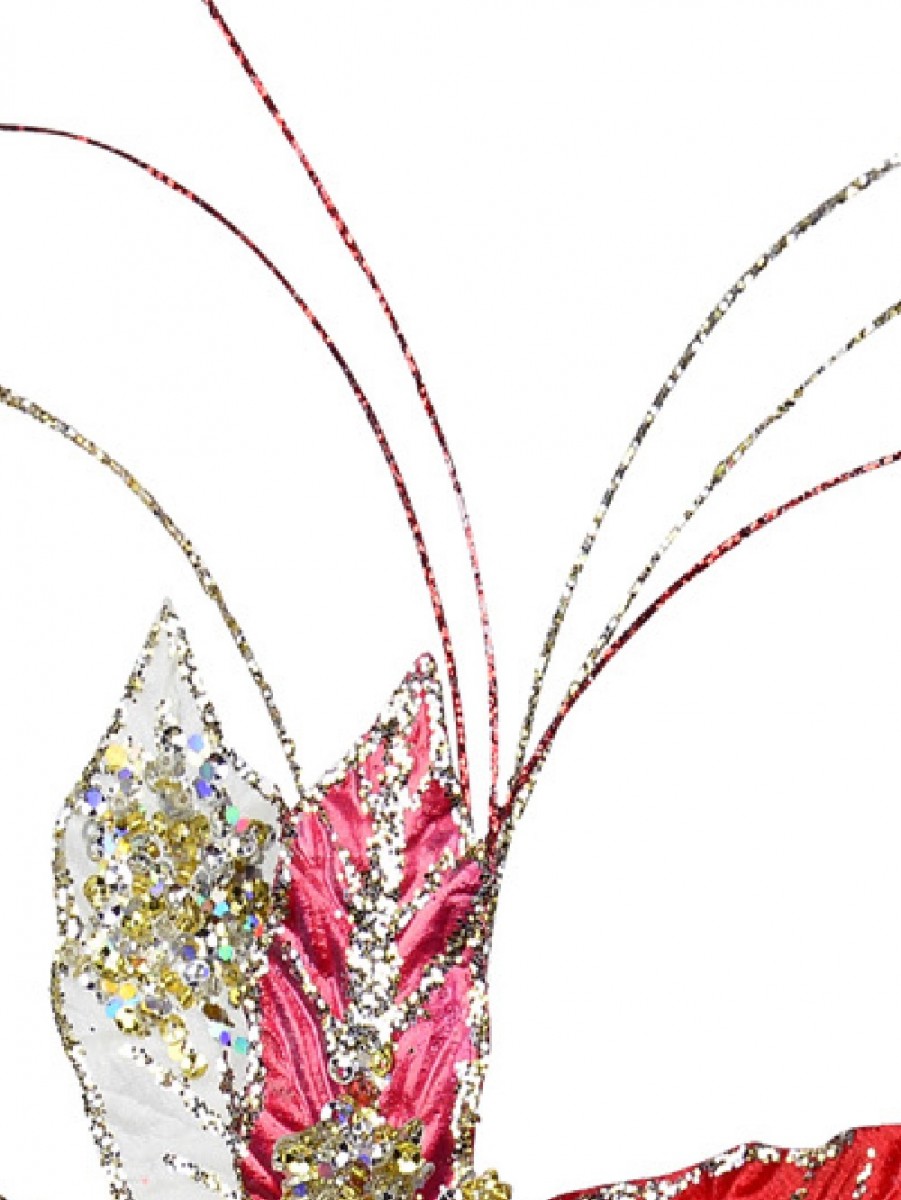 There are a lot of reasons to notice poinsettia decor, mainly because it has stunning holiday beauty that's impossible to ignore, and this Red, Gold, & Silver Poinsettia Pick With Clip is no exception. The difference with this piece is that, especially thanks to its stand-out strands and shimmering designs, it has a vibrant flair to it that's meant to get noticed wherever it's placed.