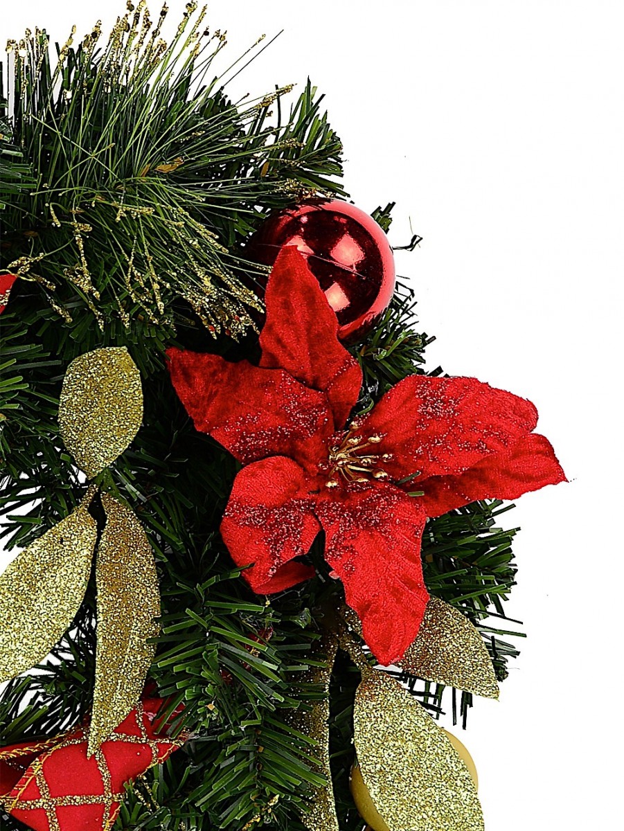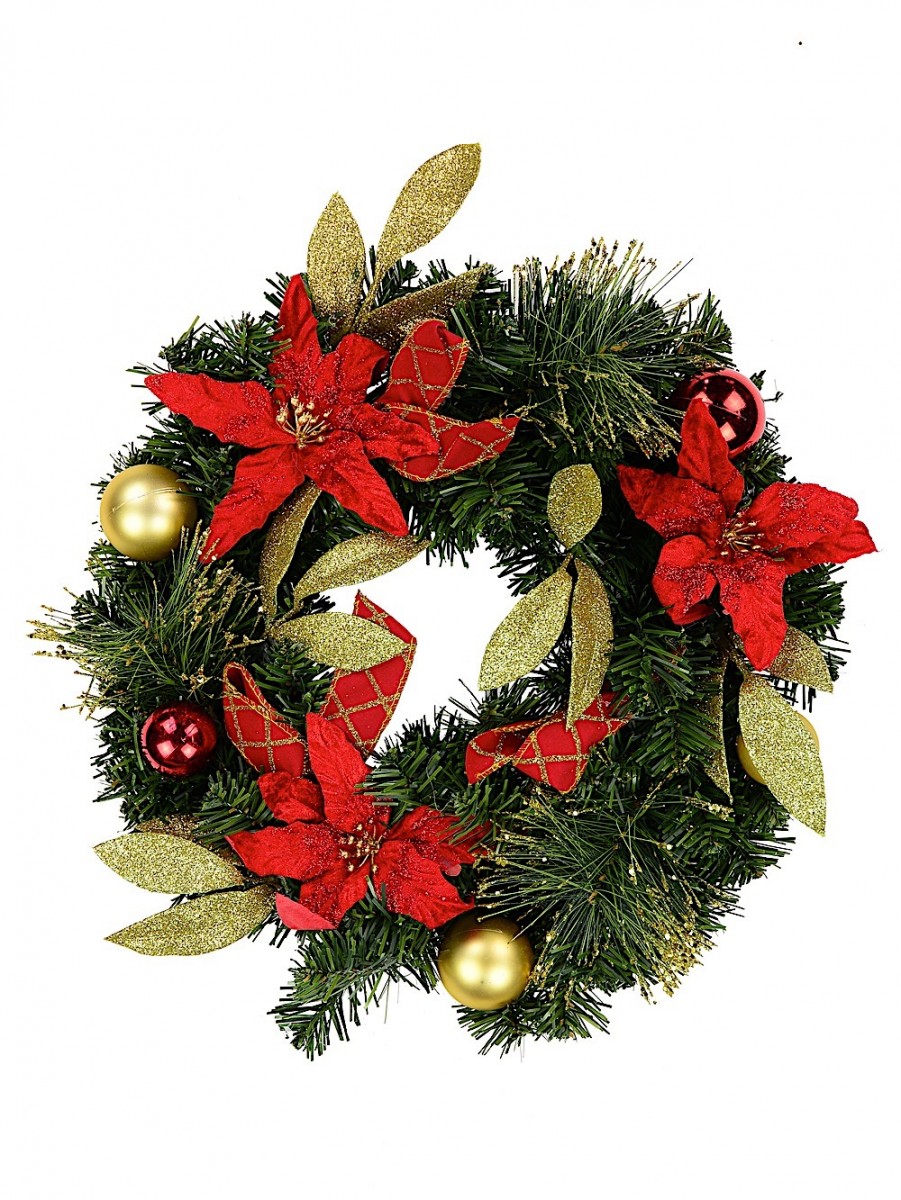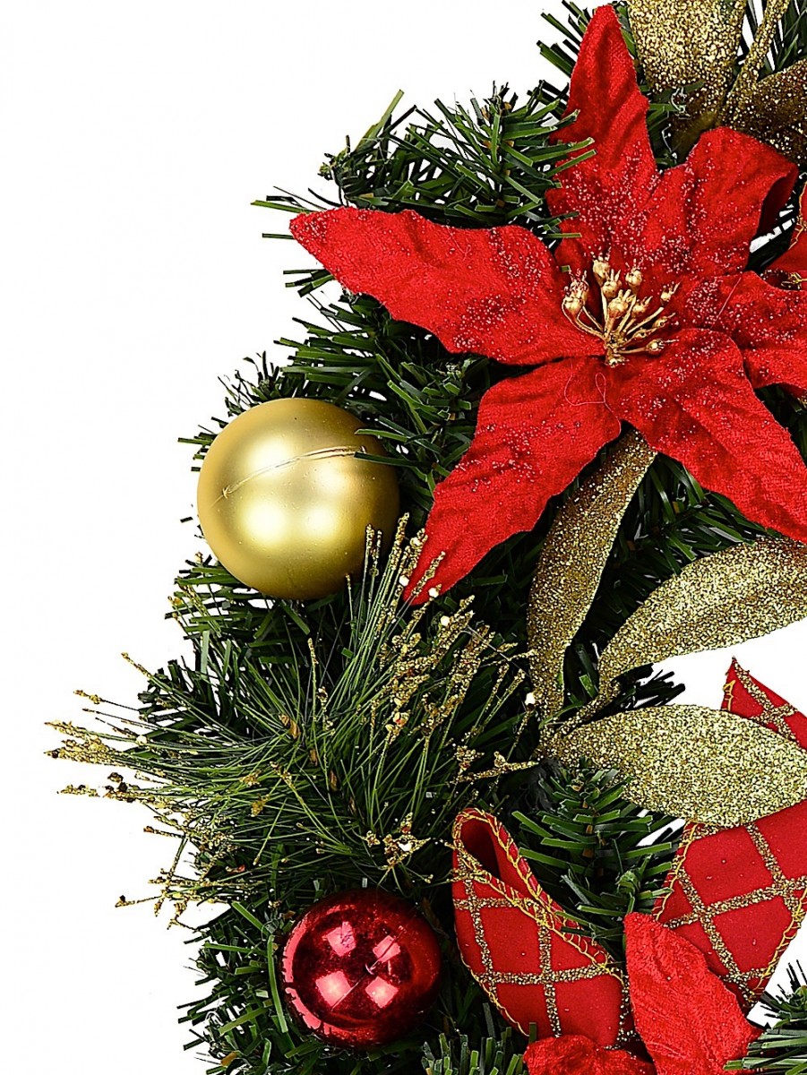Decorated nicely in dark green, warm red and shimmering gold colours, this gorgeous 40cm wreath is of better quality and may just be your Christmas tree inspiration this year. Full with traditional pine branches - some with gold tips, glossy red and gold baubles, gold glittered leaves and elegant red poinsettias; this is one wreath that you will definitely look forward to seeing on our door!