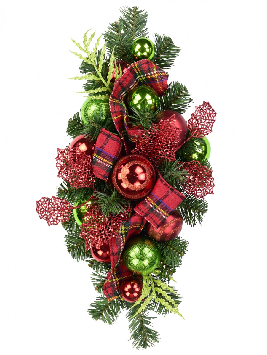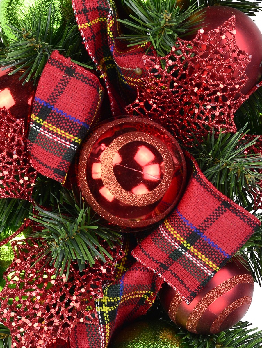 Red & Green Bauble Pre-decorated Centrepiece With Tartan Ribbon - 60cm