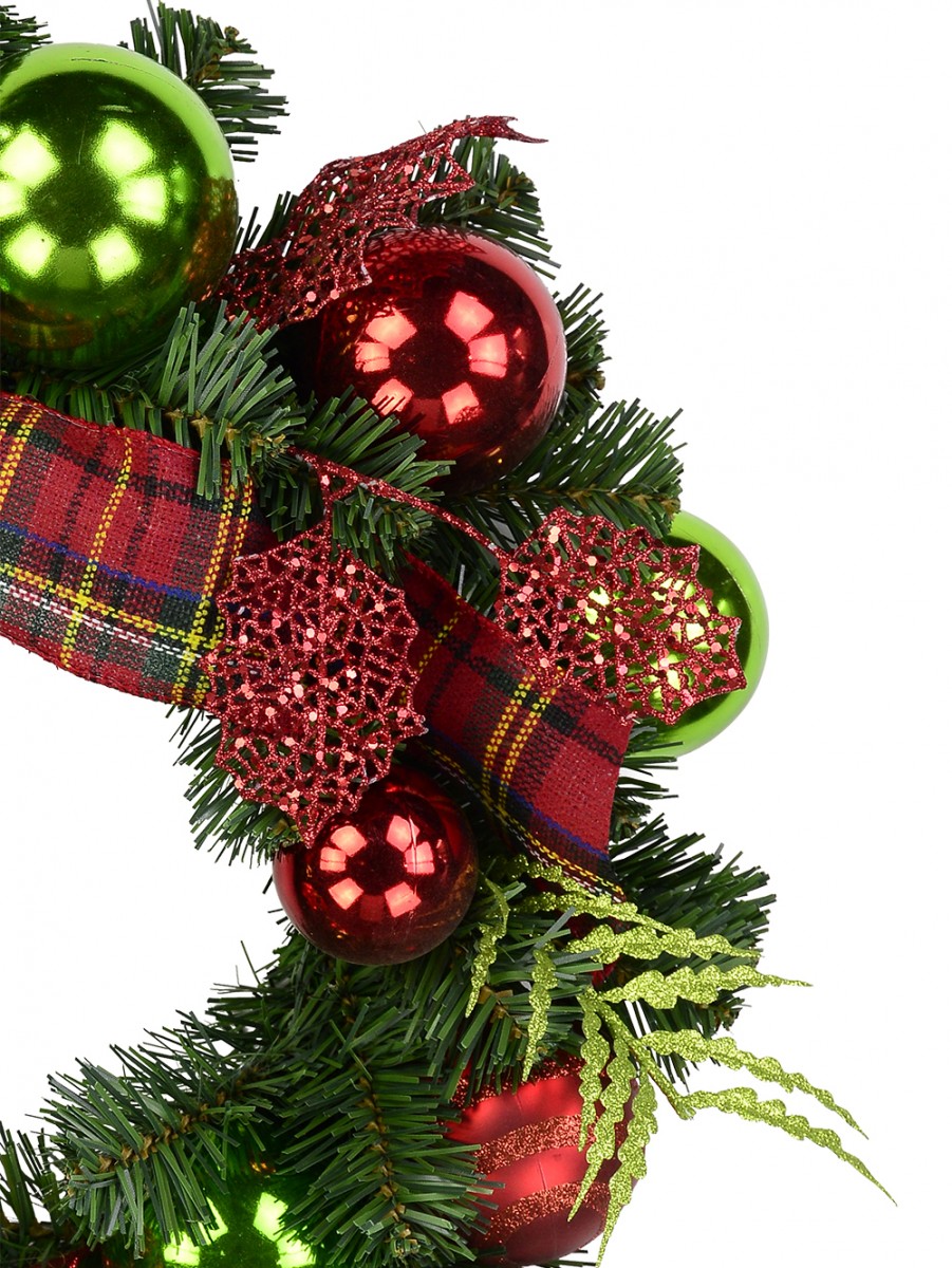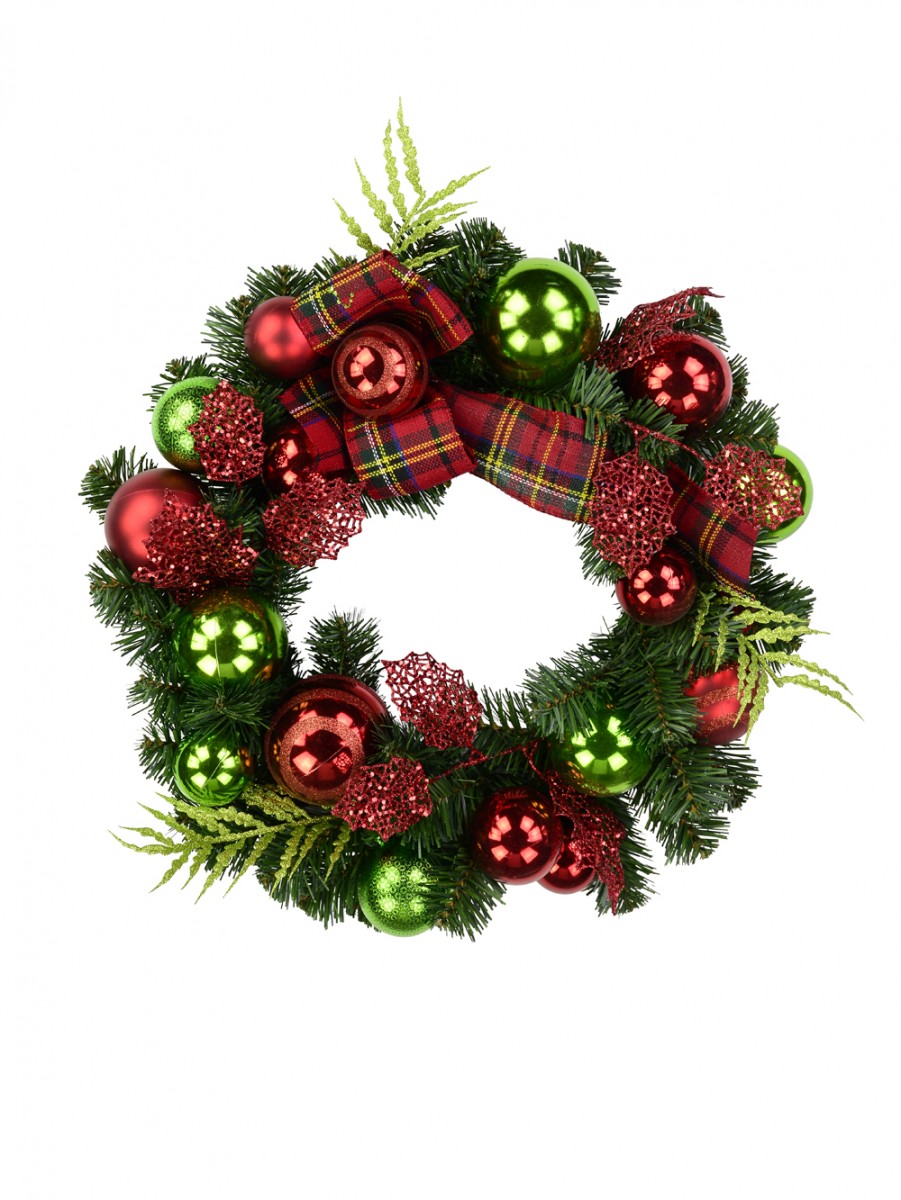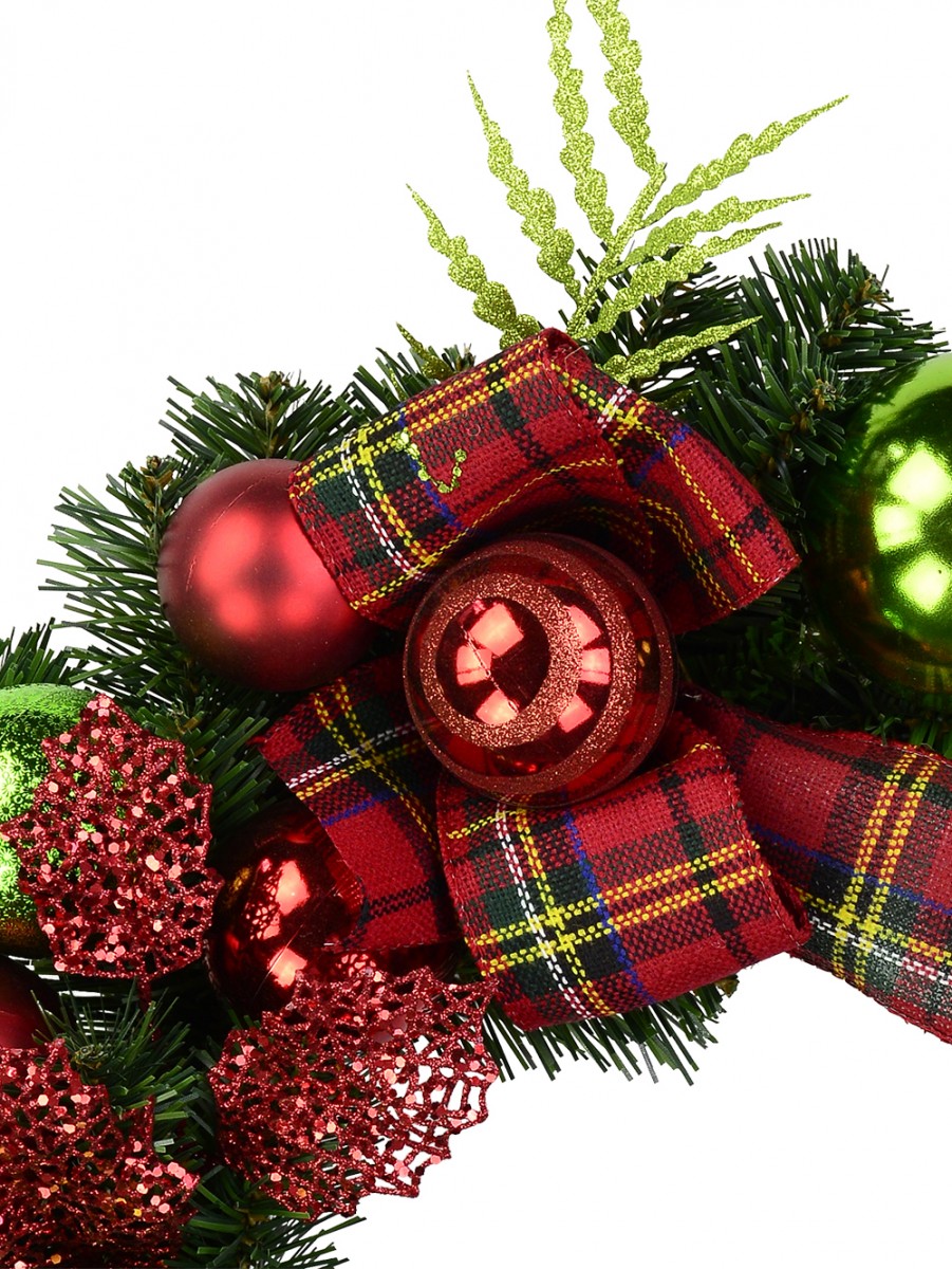 When you see this Pre-decorated Wreath with tartan ribbon and baubles, you know it's the holiday season as it brings a sense of nostalgia with a little Scottish charm! This is a stunning traditional shaped green PVC pine wreath is made up of flourishes of differently sized baubles in the festive colours of red and green with differing finishes.
